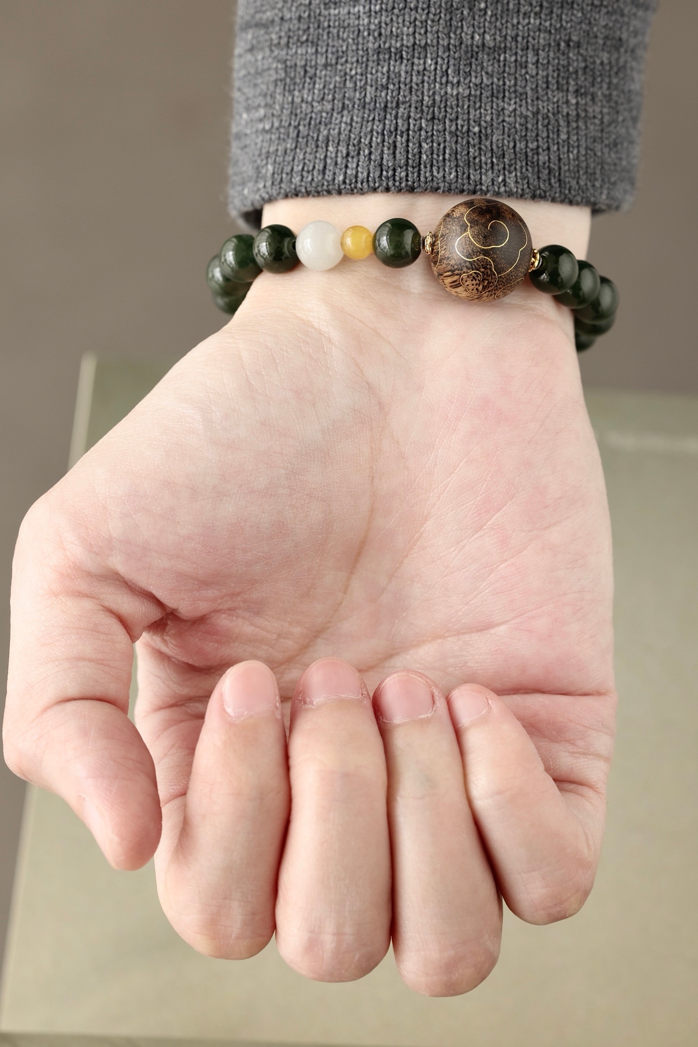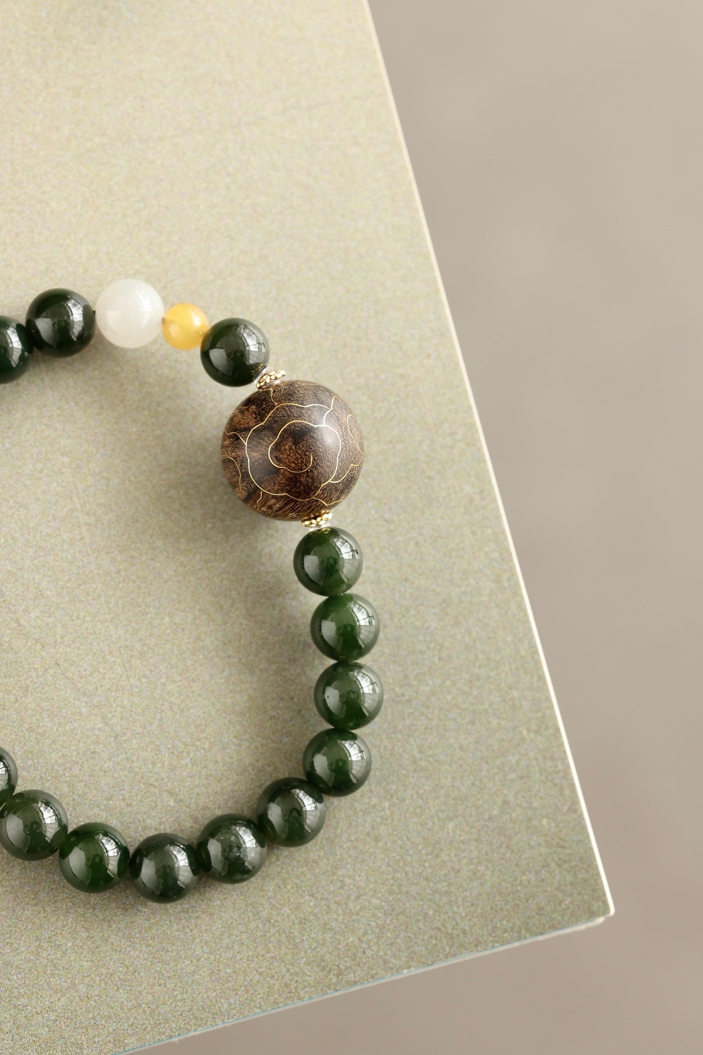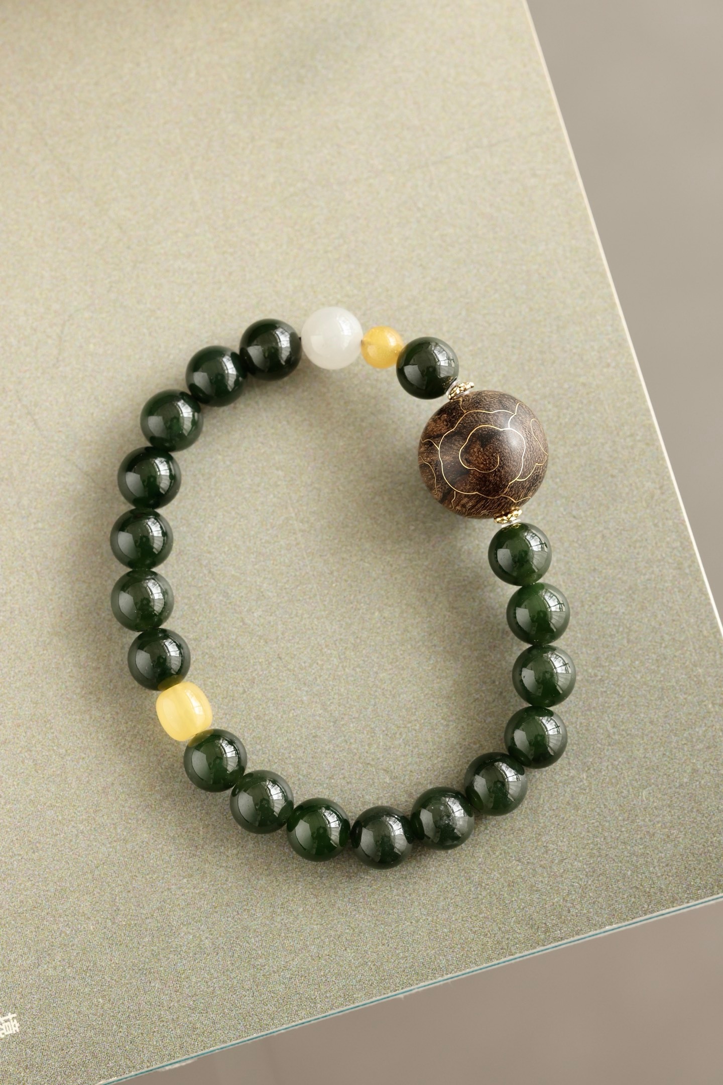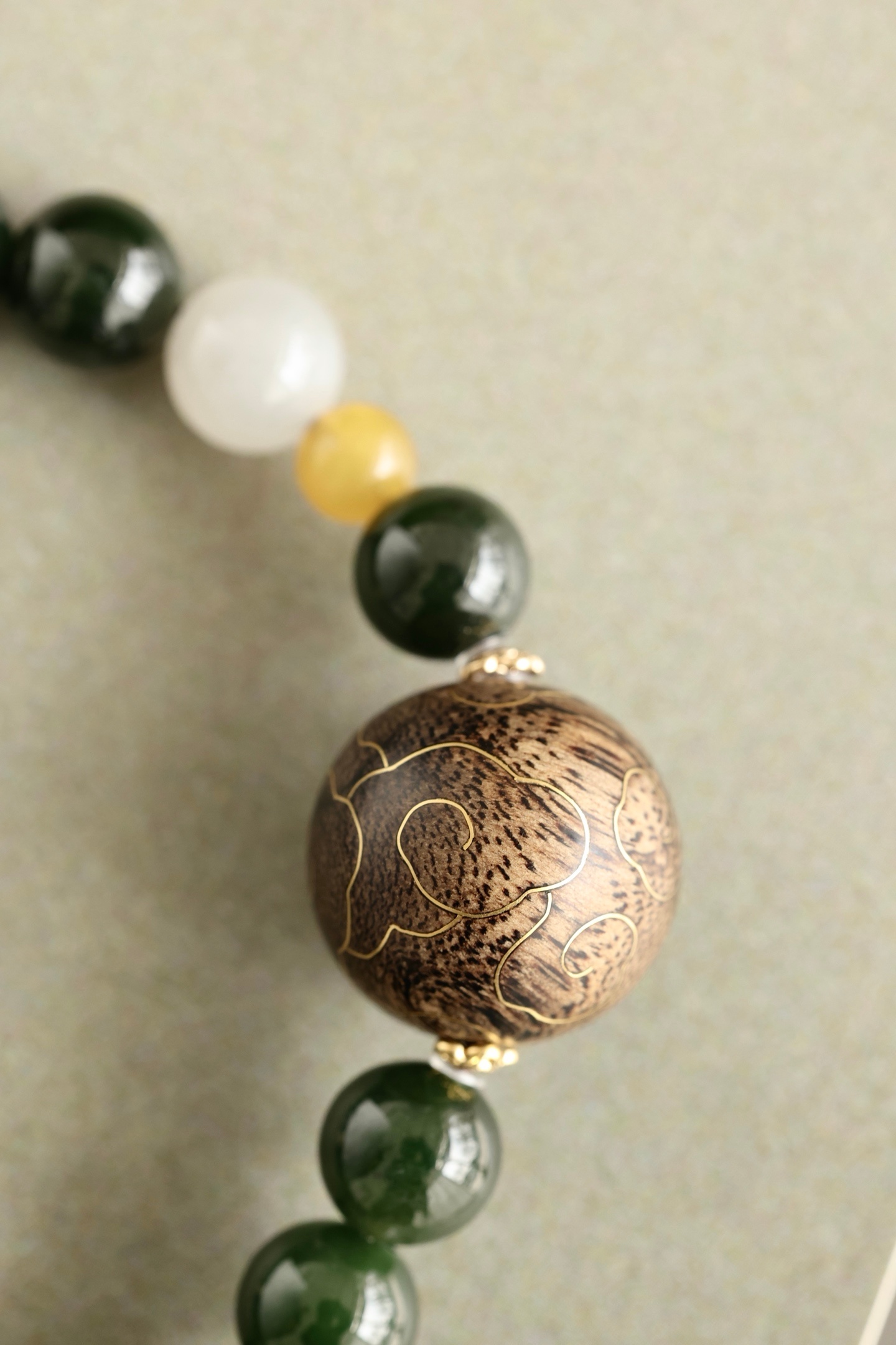 沉水17mm圆珠,油脂饱满,香气馥郁,周身祥云由古法错金工艺制作,气韵富贵,古雅端方,碧玉、蜜蜡、黄玉等配饰点缀其上,佩戴文气不失时尚之感。