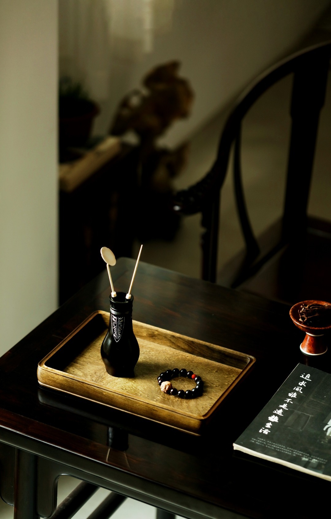 择优质老料,金丝荧光质感,榫卯工艺,严丝合缝,雨滴纹理,更添灵动,案上收纳,可承置文房雅玩。