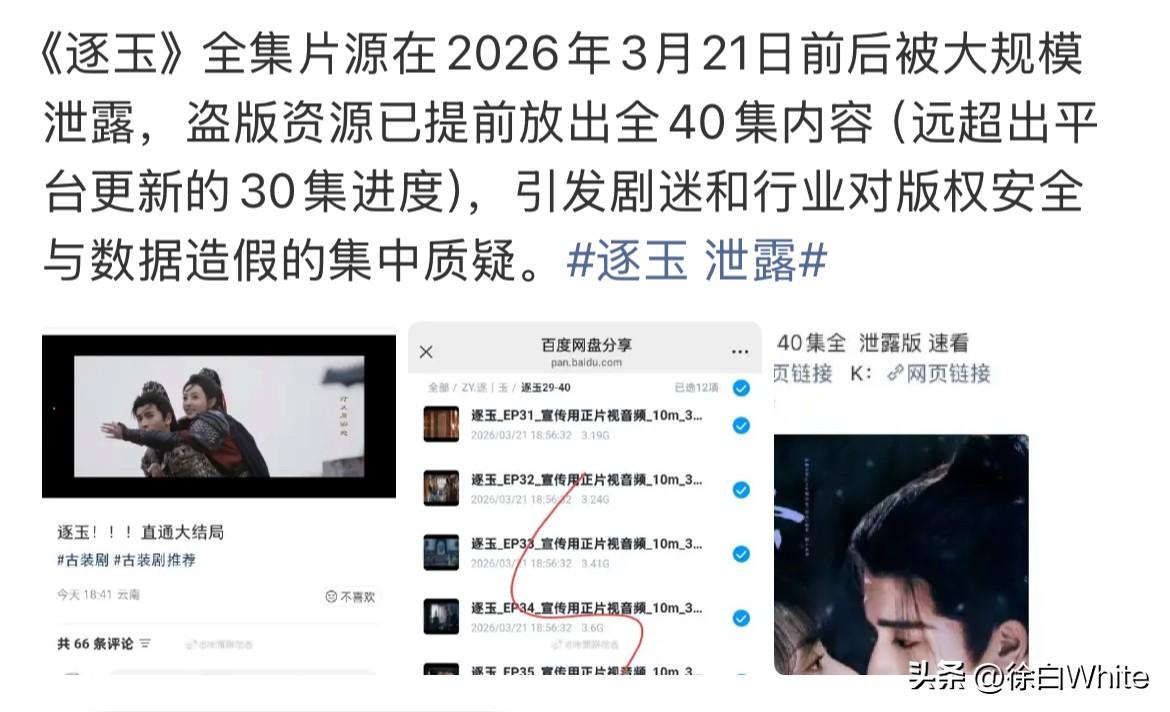 3月21日,张凌赫田曦薇《逐玉》全集泄漏上热搜,播到30集,泄漏出了40集! 有一说一,这部剧看的人已经很少了,泄漏的影响不算大,这也就是逐玉磨集均,换作其他剧,早就播完了!看到有人拿这件事跟杨紫李现《亲爱的热爱的》比,完全比不了,亲爱的热爱的那是真热播,泄漏影响很大,逐玉都糊了,本来看的人就不多了,泄漏影响到的人并不多,而且很多人都因编辑后期写的剧情太差,主动弃剧不看了,更不在乎后面泄漏的10集了!