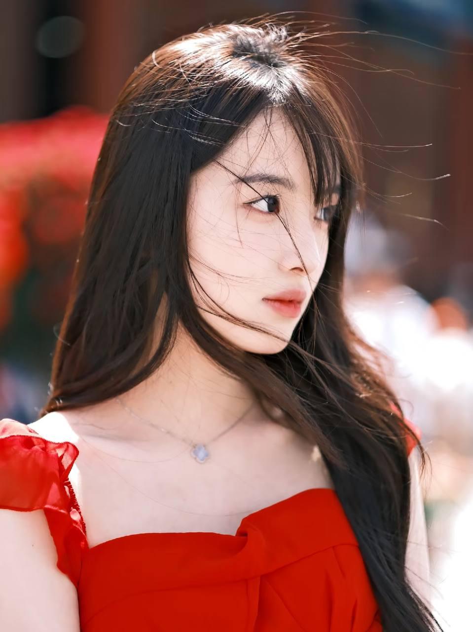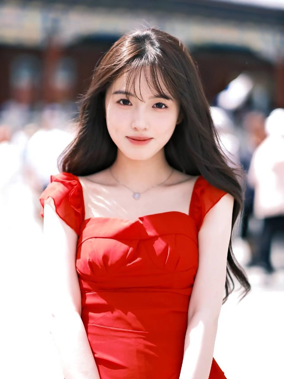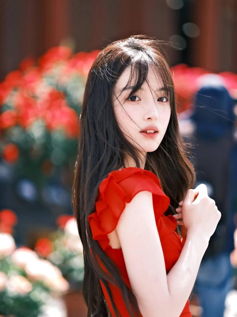红衣美人倚花丛,风姿绰约似画中。美少女 红衣少女自拍 玫瑰红装美女