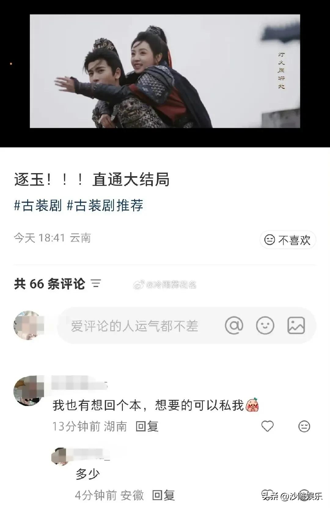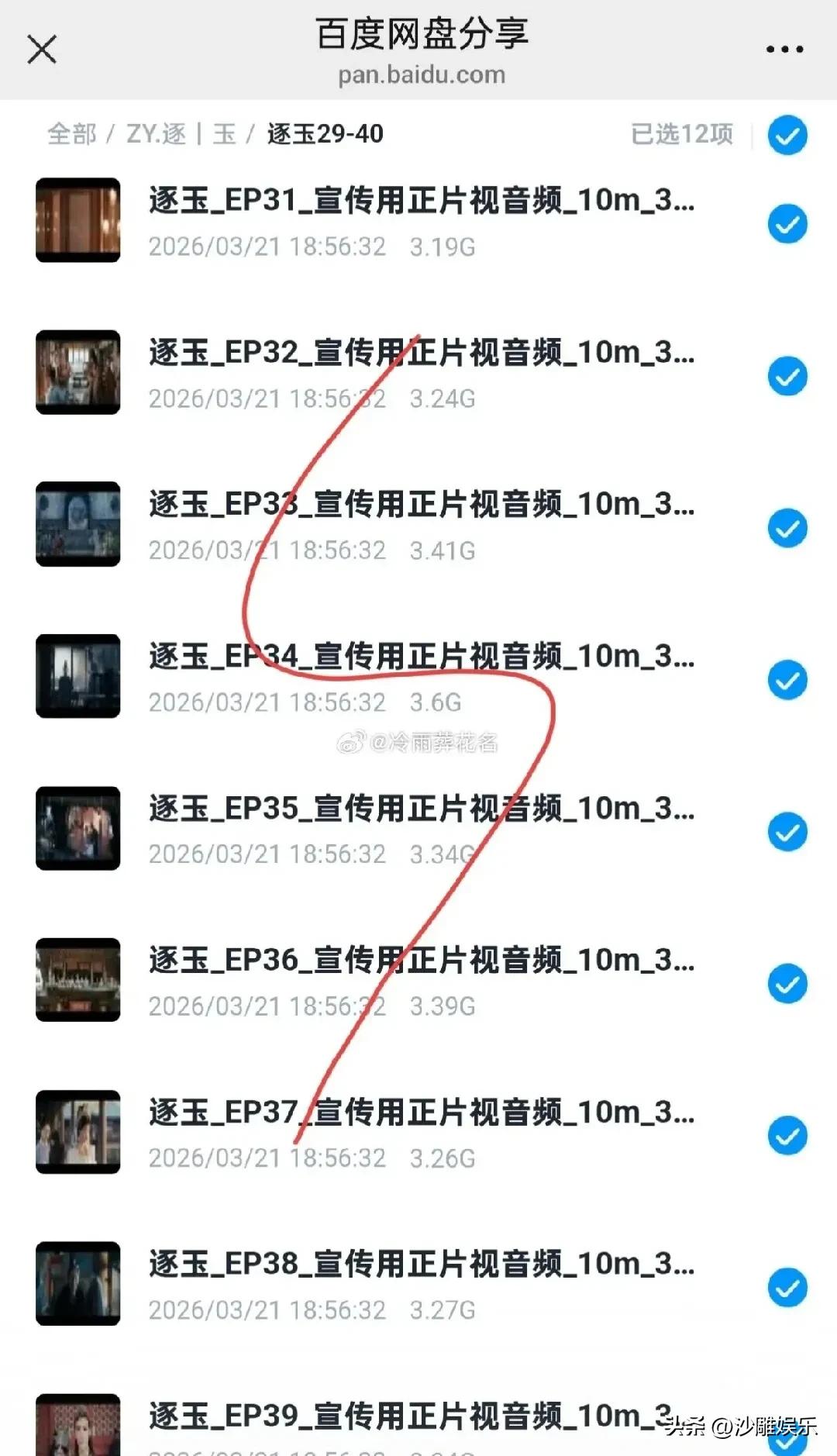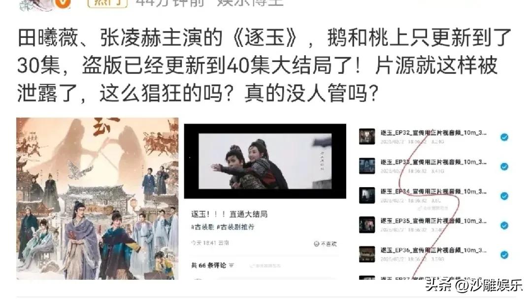 这是今天娱乐圈最离谱的事! 3月21日,娱乐圈白天一片岁月静好,没想到晚上就炸出了一个大瓜——而且是个让追剧党集体破防的坏消息。 热播剧《逐玉》出事了,而且是大事。 就在正版平台腾讯视频、爱奇艺刚刚更新到第30集的时候,百度网盘、微博、抖音上已经铺天盖地流传着“29-40集全”的高清资源。单集文件超过3GB,连“樊长玉封将”“谢征代罚”这种大结局关键情节都被提前扒了个精光。 正版还没走完半程,盗版已经直接剧透到大结局,这谁顶得住? 更离谱的是,评论区里明目张胆叫卖资源的大有人在,“想回个本,想要的私我”——泄露的片子被当成了明码标价的生意。这不是盗版,这是直接骑脸输出。 说起来,《逐玉》这部剧最近势头正猛,田曦薇和张凌赫的“双强”人设加上甜虐交织的剧情,圈粉速度肉眼可见。可谁能想到,热度刚烧起来,就被盗版浇了一盆冷水。 其实这场风波早有苗头。3月中旬就有人零星发现未播片段外流,只是当时没掀起太大水花。到了21日,彻底爆发。 值得玩味的是,就在泄露前几天,《逐玉》刚调整了更新节奏,从日更2集改成了工作日单更,本来就让不少观众等得心痒痒。这下倒好,更新慢的矛盾直接被盗版推到了风口浪尖。 目前剧组和平台还没有正式回应,但这件事暴露出来的问题已经很扎眼了:热播剧的版权保护,到底还能不能守住? 一部剧从拍摄到播出,背后是无数人的心血和真金白银的投入。盗版不仅抢了流量,更是在透支整个行业的信任。观众不是不愿意支持正版,而是当正版更新慢、盗版抢先机的时候,耐心真的会被一点点磨光。 《逐玉》这次被盗版“提前大结局”,希望不只是热搜上的一阵风。毕竟,如果连追剧都要提心吊胆怕被剧透,那观众的信任,可真就耗不起了。
