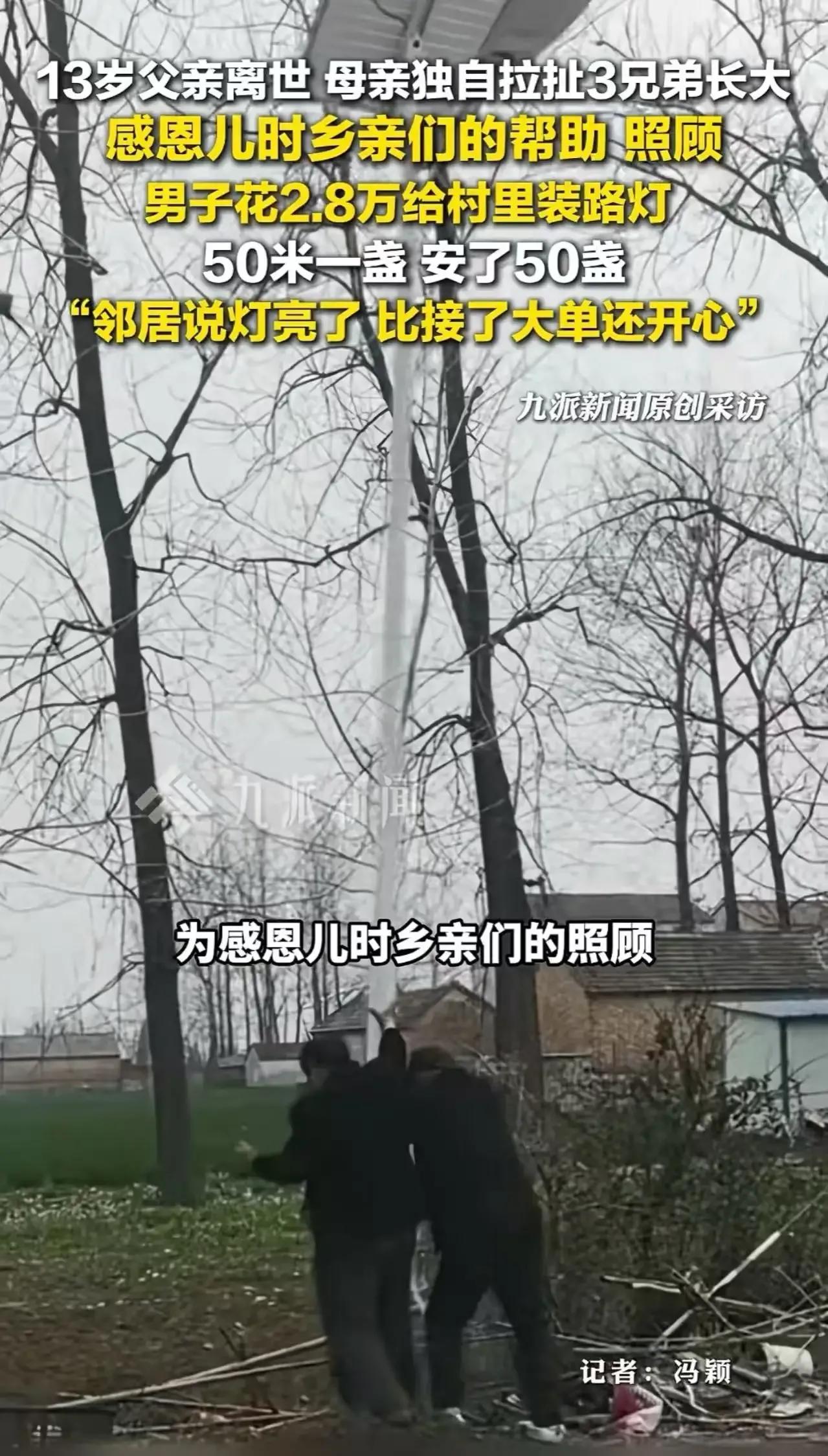 安徽宿州一男子,13岁时父亲离世,家里连学费都交不起,可乡亲们却纷纷伸出援手,这是怎么回事呢? 原来,在侯先生年幼时,父亲突然离世,让本就贫困的家庭雪上加霜。学费交不起,生活也陷入困境。然而,乡亲们并没有袖手旁观,他们偷偷塞过来几十块钱,帮助侯先生度过难关,甚至都不让打欠条。这份淳朴的乡情,让侯先生铭记在心。在乡亲们的护佑下,他一点点长大,如今已有了自己的事业。为了感恩儿时乡亲们的照顾,侯先生决定为村里做点实事。他花费2.8万,为村里装上了路灯,让夜晚的村庄不再黑暗。每当夜幕降临,一盏盏路灯照亮了乡亲们回家的路,也温暖了大家的心。这份知恩图报的举动,不仅让村里焕然一新,更让乡亲们感受到了浓浓的温情。 侯先生的举动,不仅给村里带来了一片光明,更让我们看到了人性的美好。知恩图报,是中华民族的传统美德,值得我们每个人去传承和发扬。快来评论区说说你的看法吧!少年离世 同学儿子离世