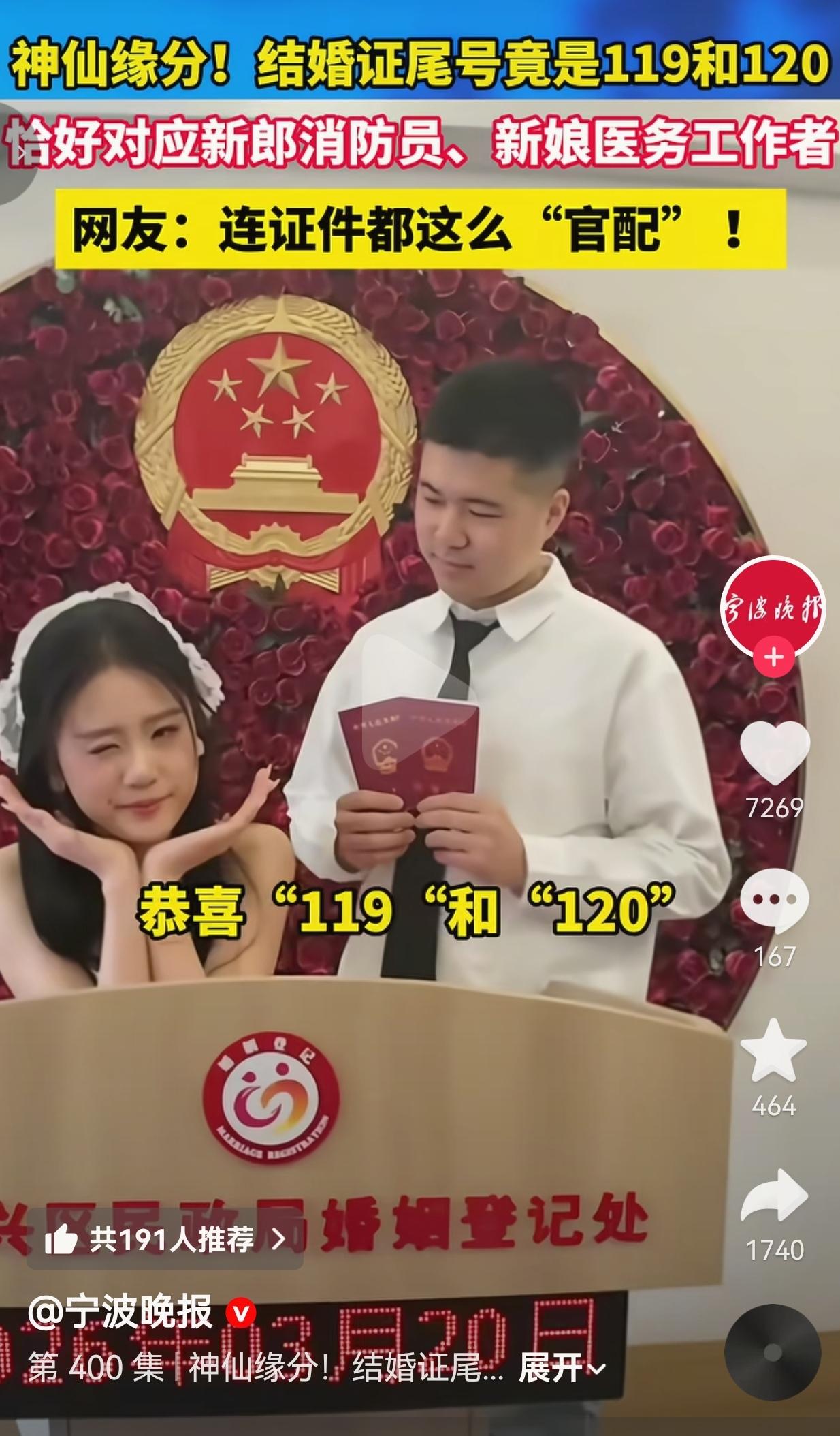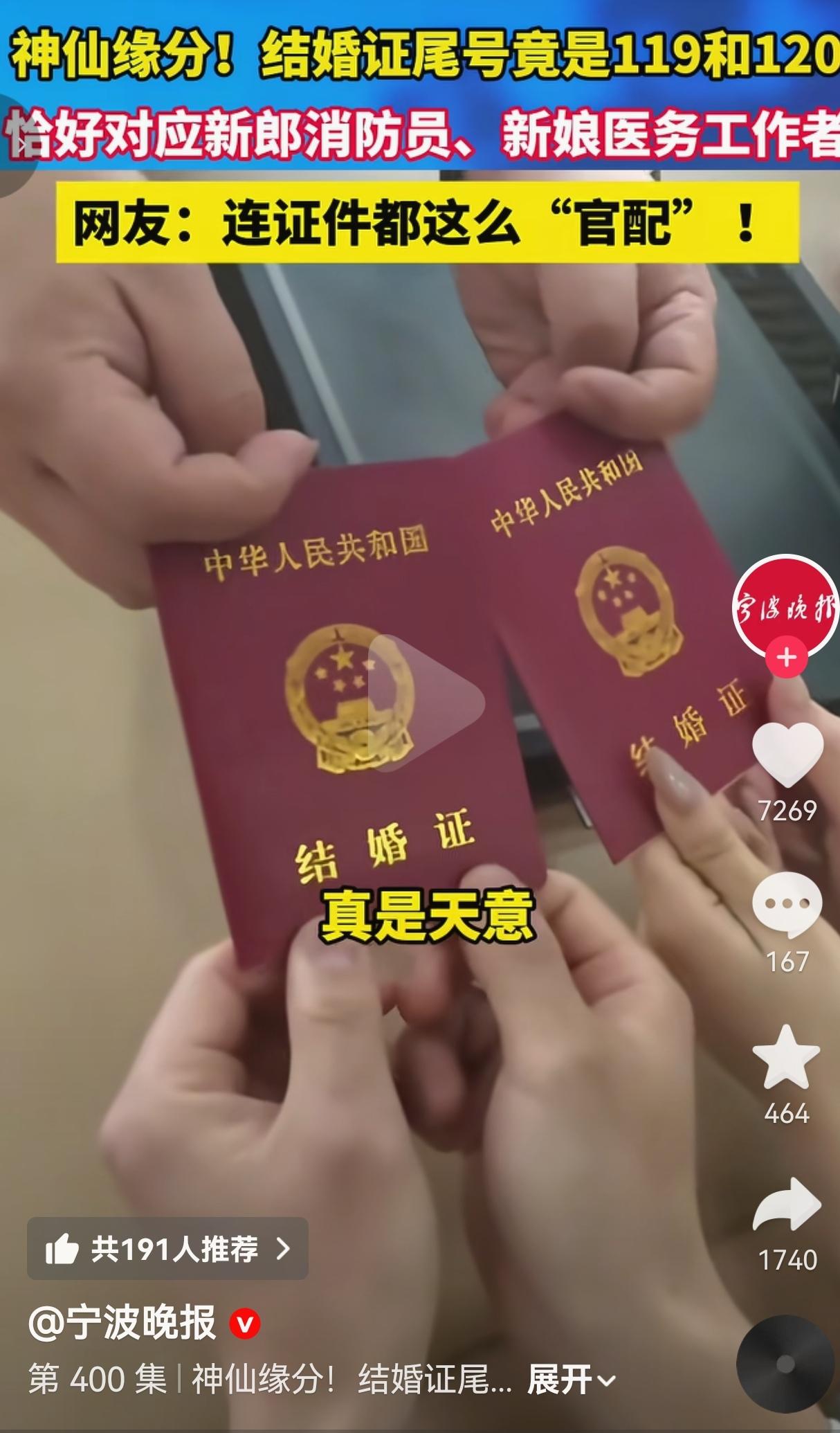 太有缘分了!消防员配医护,结婚证尾号竟是119和120!这才是老天爷按头磕的CP! 辽宁丹东这对新人,直接把“天生一对”焊死在结婚证上了! 3月20号,辽宁丹东一对新人去民政局领证,本来就是普普通通的好日子,结果打印结婚证的时候,工作人员都看傻了:新郎是消防员,结婚证号尾号119;新娘是医护人员,尾号120! 俩人当场懵了,反复跟工作人员确认:“我们没选号啊,真是系统自动出的?” 你敢信?连系统都在磕这对“应急CP”! 一个守着万家灯火,冲在最前面灭火救人;一个守着生命防线,在急诊室里跟死神抢人。 平时各自在岗位上拼命,现在连结婚证都在喊:这俩就是天选一对! 现场所有人都跟着起哄,办事员都笑着说:“干这么多年,头一回见这么巧的!这就是天意!” 俩人捧着红本本笑得合不拢嘴,新娘还红了眼眶,说:“以后我们家就是119+120,守护彼此,也守护更多人。” 不少路人看到这一幕,都纷纷送上祝福,说这是见过最有意义的结婚证,羡慕又感动,希望他们一辈子平平安安、甜甜蜜蜜。 网友们直接炸锅了,有的网友说:“我也是消防员,我媳妇是护士!看到直接泪目!我们日常就是你出警我值班,看到这对突然觉得所有辛苦都值了!这才是最美爱情!” 也有的网友说:“救命!这是什么神仙缘分!119配120,不就是我们天天并肩作战的样子吗?连证件都在官宣官配!” 也有的网友说:“哎哟喂!比电视剧还甜!老天爷都亲自牵红线,这俩孩子必须幸福一辈子!以后生娃叫110,直接凑齐应急天团!” 还有的网友说:“破防了!他们天天守护我们,现在终于有人好好守护他们了!必须锁死!祝百年好合!” 我看完直接一身鸡皮疙瘩!这哪是巧合?这分明是老天爷在给英雄发糖! 我们总说“哪有什么岁月静好,不过是有人替我们负重前行”,可这些替我们扛事儿的人,也该有个懂他们、疼他们的人。 119的警铃、120的鸣笛,是他们的日常,也是他们爱情最硬核的背景音。 他们把青春献给陌生人,现在终于能把温柔留给彼此,这才是最动人的浪漫。 别跟我扯什么家境、彩礼、门当户对。最好的爱情,从来不是物质对等,而是灵魂相配——你守护世界,我守护你,我们一起守护更多人。 这世上最浪漫的,不是鲜花钻戒,是你我的职业连证号都在说“天生一对”;最动人的承诺,不是甜言蜜语,而是“我是119,你是120,我们一起守着彼此,守着万家灯火”。 119遇上120,从不是巧合,是英雄与英雄的双向奔赴,是连老天都在磕的神仙爱情! 对此,你怎么看?