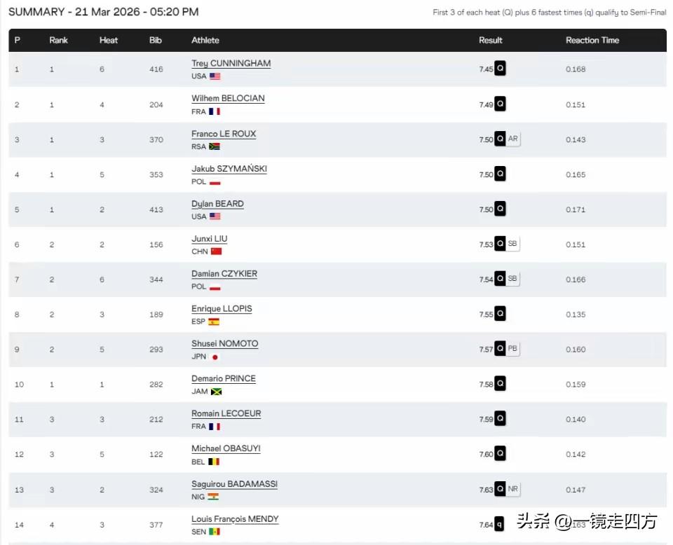 在波兰托伦进行的室内世锦赛男子60米栏预赛,参赛的两位中国选手刘俊茜和陈圆将先后跑出7秒53和7秒64,分别排名本小组第二和第三,成功晋级半决赛,预赛成绩总排名第6和第15,美国名将坎宁安以7秒45排名预赛第一。