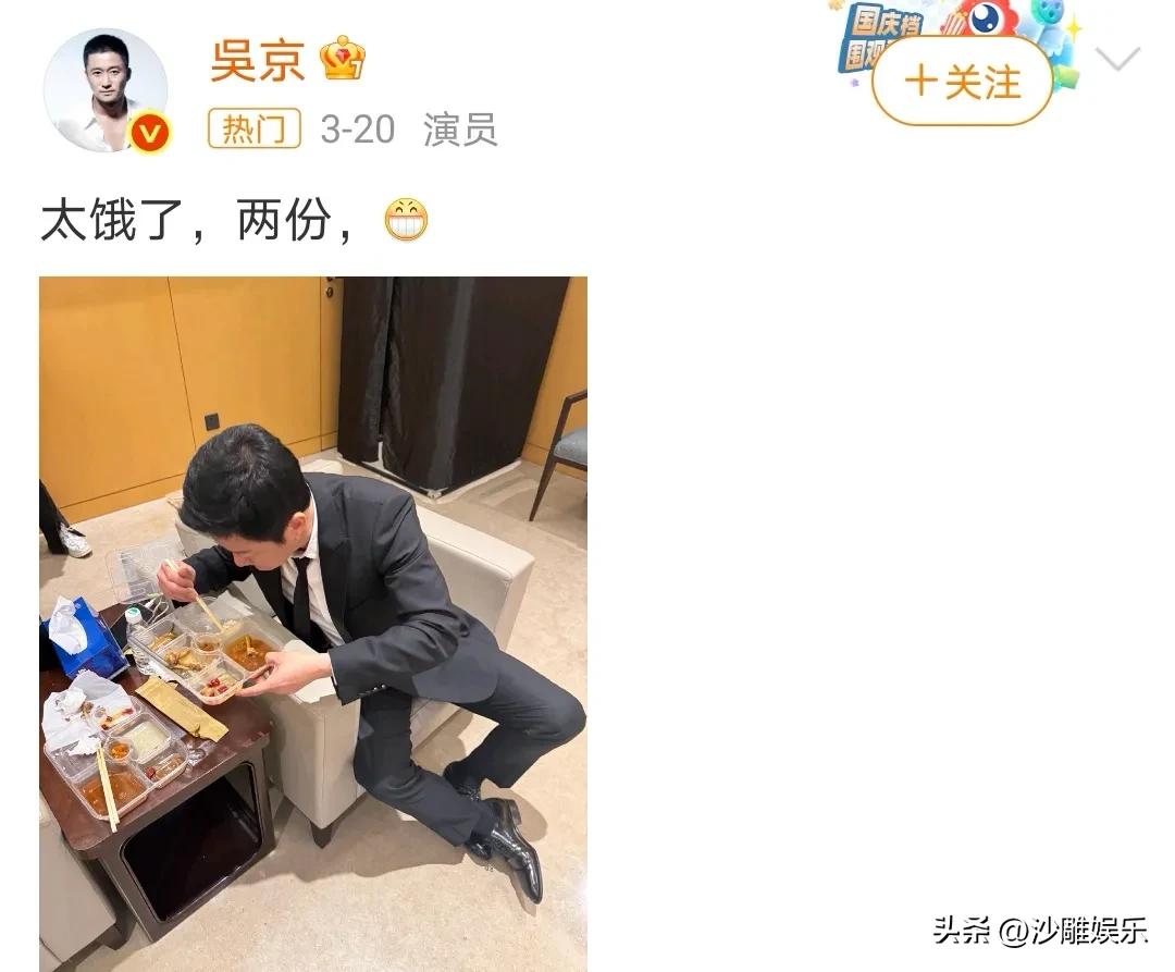 吴京,太激动了! 3月20日晚上,一向低调的吴京突然在社交平台扔出一颗“重磅炸弹”,短短五个字,却瞬间点燃了网友的好奇心。 原来,这位百亿票房影帝晒出了一张自己吃饭的照片,配文直白又接地气——“太饿了,双份!”照片里的吴京穿着笔挺西装,却毫无形象地窝在矮沙发上,就着低矮的茶几,对着两份外卖大快朵颐。四道家常菜朴素得很,和他“身价过亿”的明星身份形成了巨大反差。 这一波操作,直接让网友炸了锅。有人笑称:“这是把西装当围裙用了?”也有人感慨:“吴京还是那个吴京,一点没飘。” 但如果你以为这只是一次简单的“干饭”秀,那就太小看吴京了。 熟悉吴京的人都知道,他对身体的“狠”是出了名的。为了角色,他曾严格执行“五无”魔鬼餐——无油、无糖、无盐、无米饭、无饮料,一天五顿,全是水煮鸡胸肉、牛肉和海鲜。换做旁人,这简直是酷刑,可吴京愣是咬牙坚持,只为贴合角色形象。 如今,他却在深夜对着双份外卖“投降”,这种从极致自律到“真性情放纵”的反差,反而让人觉得他更真实、更可爱。 时间倒回几十年,吴京是《太极宗师》里白衣飘飘的杨昱乾,是《小李飞刀》里侠肝义胆的阿飞,也是《杀破狼》里那个让人不寒而栗的硬汉警察。一路摸爬滚打,他用拳头和汗水在娱乐圈打出了自己的江山。 《战狼2》让他封神,却也让他站在舆论的风口浪尖。有人调侃他“爱国人设”,有人质疑他“吃老本”。但他从不解释,只是默默用作品回击。最近的《镖人:风起大漠》,他再次用实力证明:吴京,依然是那个能打的吴京。 娱乐圈里,太多明星活在滤镜和人设里。而吴京,偏偏是个“反骨仔”。他可以穿着几十万的西装,蹲在茶几前吃外卖;也可以为了一个镜头,在军营里真刀真枪练18个月。他的“真”,不是营销出来的,是刻在骨子里的。 有人说他“直男”,有人说他“粗粝”,但正是这种不装、不端、不油腻的真实感,让他成了观众心里那个“自己人”。在这个流量当道的时代,吴京用一碗双份外卖告诉我们:真正的巨星,从来不需要端着。 从武打新人到票房神话,从“双份外卖”的接地气到“五无餐”的狠劲,吴京的真性情和对演艺的坚守,让他在娱乐圈走出了一条独特且扎实的路。 这一夜,五个字,一碗饭,我们看到的,是一个真实到骨子里的吴京。