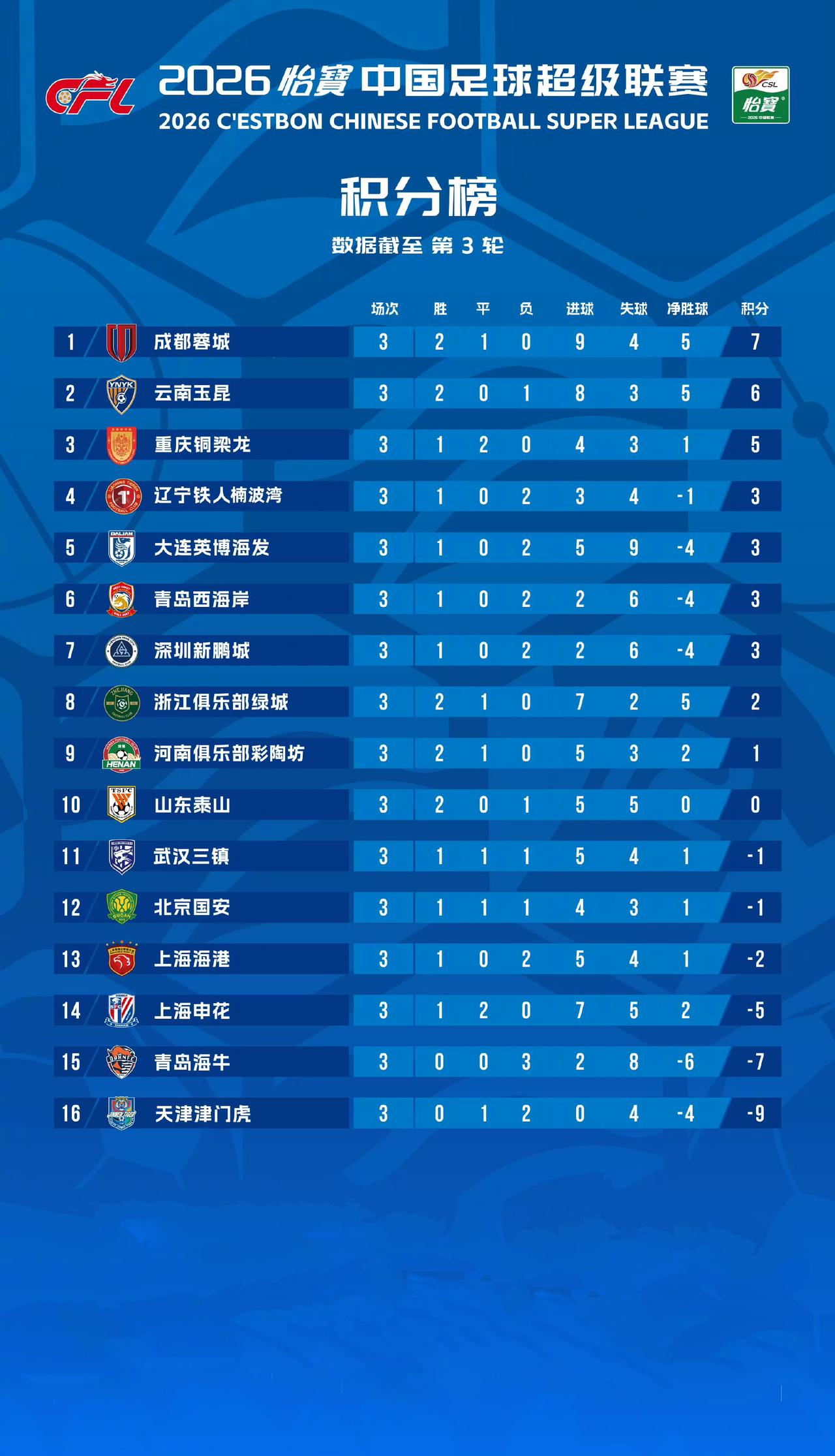 中超联赛最新积分榜!2026中超联赛战罢三轮,和以往赛季不同,三连胜的球队没有,负分球队多达6支,其中就包括卫冕冠军上海海港负2分,上海申花负5分,北京国安负1分,山东泰山0:4完败于云南玉昆,积分清零后转正真难啊!成都蓉城两胜一平积7分,领跑积分榜,云南玉昆、重庆铜梁龙积6分紧随其后,三队目前形成冲冠三人组,其中任何一支球队首夺中超联赛冠军都不意外,传统豪强都为负拼搏了,没功夫争冠了!青岛海牛主场1:4负于浙江队,天津津门虎遭遇三连的,一个负7分,一个负9分,预定两个降级名额!