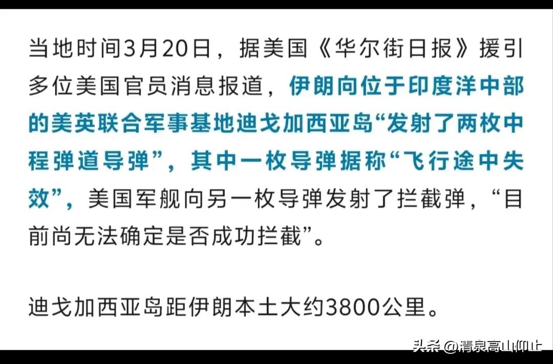 美伊战局迎来最大变数? 来自美媒华尔街日报的披露,美军在印度洋上的迪戈加西亚岛的军事基地,遭受两枚伊朗导弹袭击! 最后结果是一枚飞行途中失败,另外一枚被美军防空导弹拦截,至于是否被击毁,暂时没有后续消息! 寥寥数字信息量很大,迪戈加西亚岛与伊朗最近的距离也超过3800公里,如果伊朗导弹发射,最少射程超过4000公里,此前外界一致认为伊朗的导弹基本在2000公里以内! 不得不衍生出如下问题? 1,双方交战已经超过二十天,伊朗居然还有射程超四千公里的导弹? 2,战争的半径注定外溢,肯定不会只局限在中东范围! 3,特朗普反复称伊朗可攻击的军事力量已经全数被销毁,现在出现如此大杀器,情报怎么收集的? 这是美媒的报道,其可信度远超特朗普,就是不知道伊朗后面是不是还会变戏法?