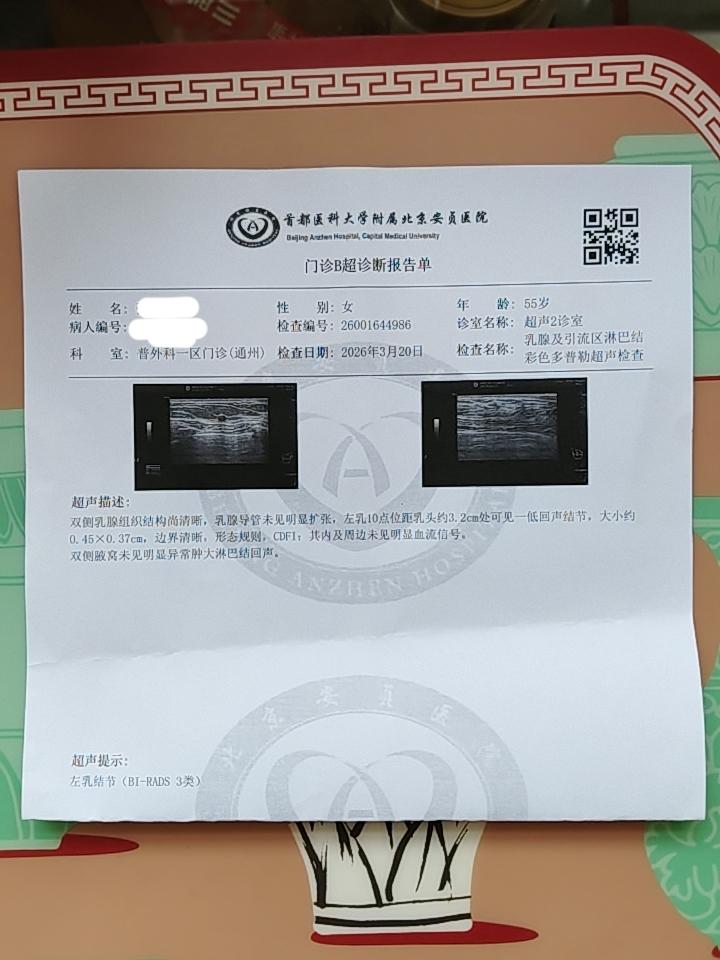 我有乳腺结节,每年都做B超,左侧结节多年变化不大。去年没查,今年年初在社区医院做B超,显示左侧有个1.5×0.4cm的结节,我心里很不踏实。 随后去通州安贞医院复查,医生检查得非常细致,连腋下都查了,最终只发现左侧一个0.45cm的小结节,并未找到社区医院所说的1.5cm结节,我便退掉了预约的专家号。 这件事让我觉得,社区医院虽报销高、不用排队、方便快捷,但检查存在误差风险,关键检查还是去大医院复查更稳妥。