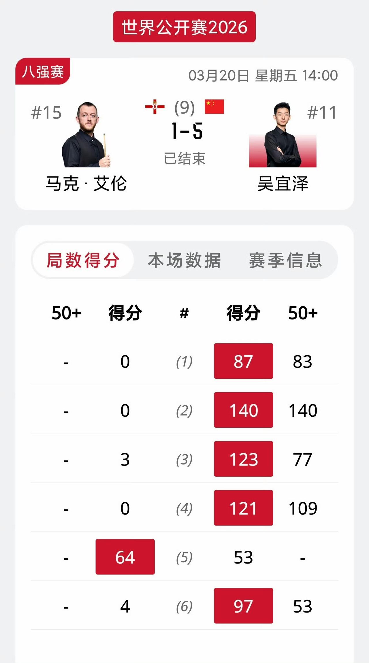 艾伦1-5不敌吴宜泽止步八强,奥沙利文6-5险胜吴宜泽晋级决赛。 他们的差别在哪