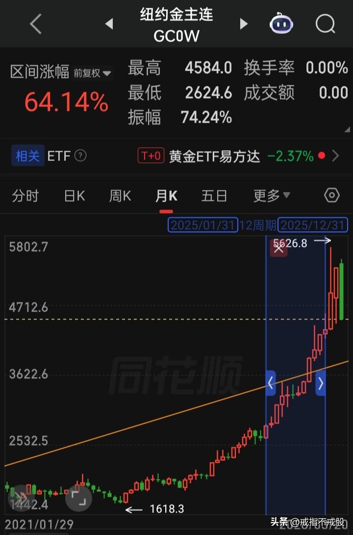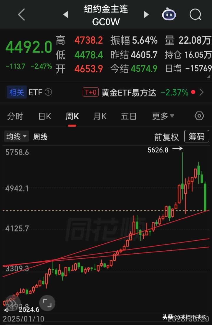 纽约金4423会破吗?4300下方可上车吗?5626会是近十年来的头部吗? 本周下跌11.26%,创下1983年3月以来的最大单周跌幅表现 2025年涨幅64.14%,创下1979年以来最佳年度涨幅表现