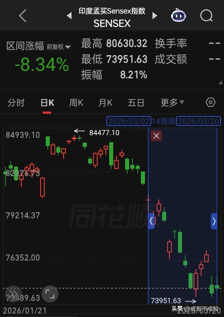 【2.28中东战火以来的主要国家股市】自今年2月28日美以对伊的中东战火以来至今(3.2-3.20)的主要国家股市表现 上证,跌4.94%,深证成指,跌4.34%,创业板指,涨1.26% 道琼斯,跌6.94%,纳指,跌4.50%,标普500,跌5.41% 印度孟买,跌8.34% 台湾加权,跌5.28% 日经指数,跌9.31% 韩国综指,跌7.41% 英国富时,跌9.09% 德国DAX,跌11.49% 法国CAC,跌10.66% 俄罗斯RTS指数,跌7.18% 富时印尼指数,跌12.42% 澳大利亚普通指数,跌7.18% 富时泰国全民指数,跌6.48% 最大涨幅“创业板指”,最小跌幅“深计成指”,最大跌幅“富时印尼” 对比近段时间的全球主要国家股市的涨跌幅,近期别指望A有救市利好出台了,可能在认为这种下跌是正常预期的,何况“创指”还上涨在