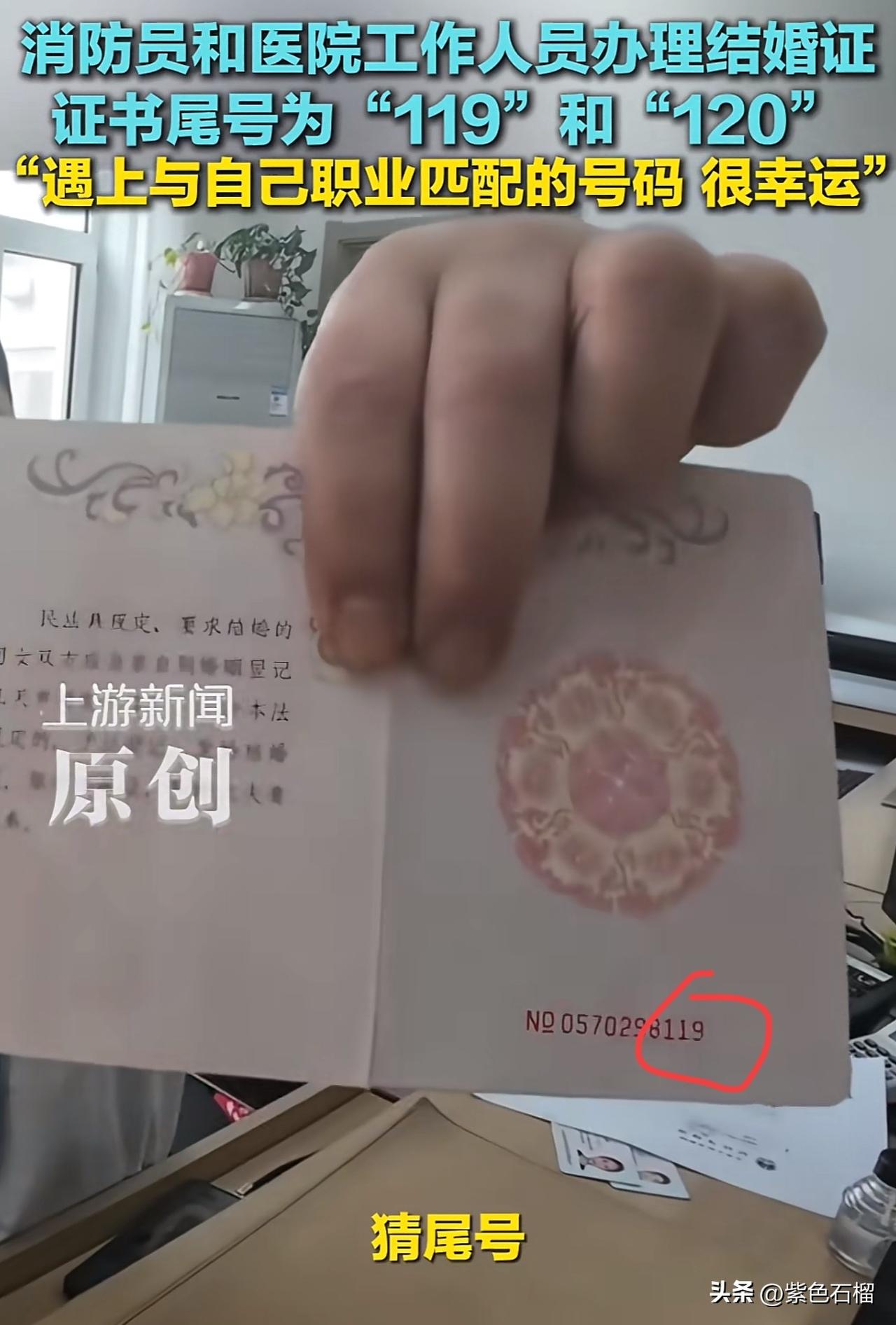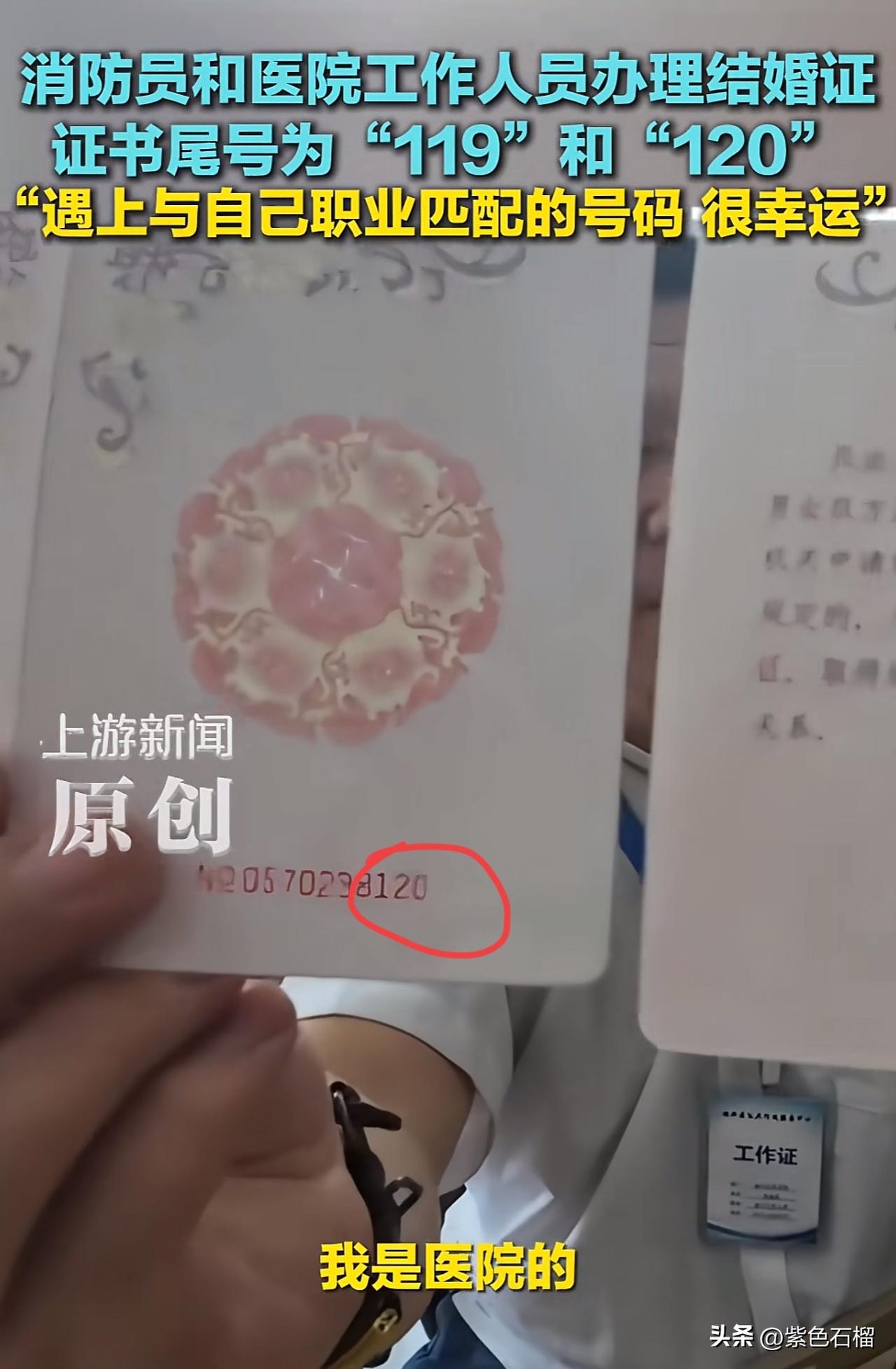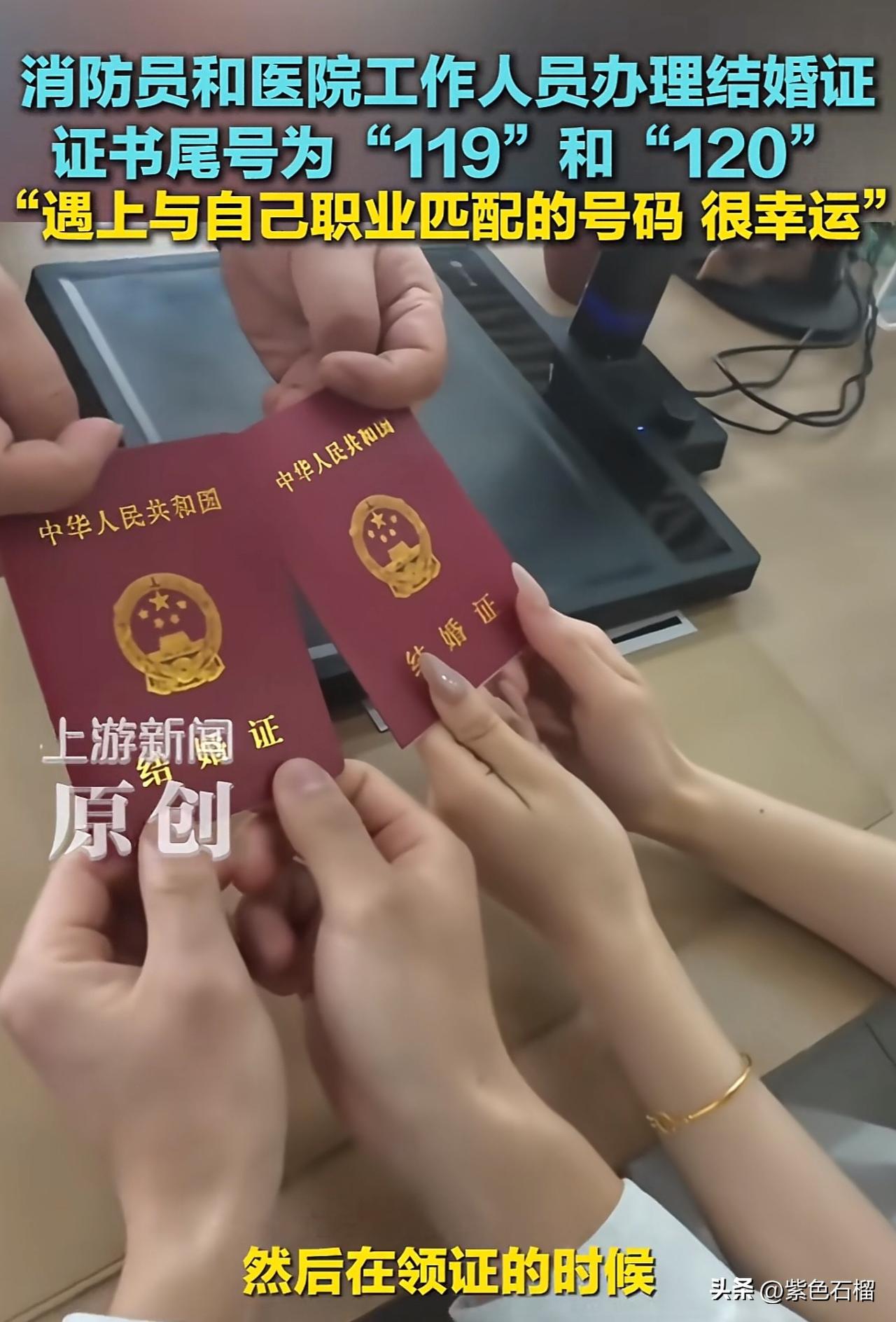 这也太幸运了吧!当新人的结婚证号恰好与自己的职业相匹配,这简直浪漫至极,原来一切都是上天最美好的安排。 3月20日,在辽宁,一对准新人前往民政局领取结婚证。工作人员询问男方的职业,男孩回答是消防员。随后,工作人员立刻递过来一张结婚证,证书尾号赫然印着:119。工作人员还特意强调,没有挑号。 女孩也觉得十分神奇,赶忙问道:“下一个是120吗?我在医院工作。”结果定睛一看,另一张结婚证尾号果真为:120。 对此,有网友调侃道:“119跟120结婚了,结都结了再生个110吧。” 还有网友深情写道:“119的勇敢,120的温柔,连结婚证尾号都在助力爱情,这大概就是你守护山河无恙,我呵护人间安康,而我们守护着彼此的心跳。” 不得不说,这两个职业都无比伟大,都在守护着人们的生命安全,他们真可谓是命中注定的一对璧人。 对此,友友们有什么想说的?欢迎在评论区交流。