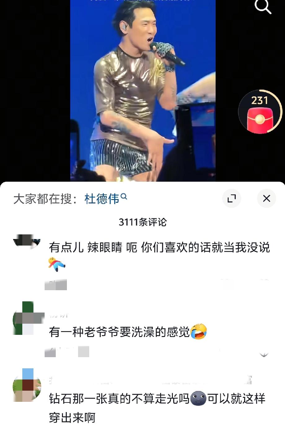 现在咋60多岁的男星也要“擦边”了[捂脸] 64岁的杜德伟,穿着闪亮透视衣配条纹裤登场,嘴里一直唱着“脱掉脱掉脱掉”,然后就这么在舞台上一路扒拉,最后就剩个闪片内裤在那晃悠。台下观众尖叫都快破音了,反应那叫一个激烈。 但说实话,一大早上刷到这视频,真觉得有点辣眼睛。[捂脸][捂脸][捂脸] 看来评论区才知道,这杜德伟还是我们小时候爱看的《第8号当铺》的男主角呢!真没想到多年后再次刷到他,竟然是这副画面,简直不忍直视啊!