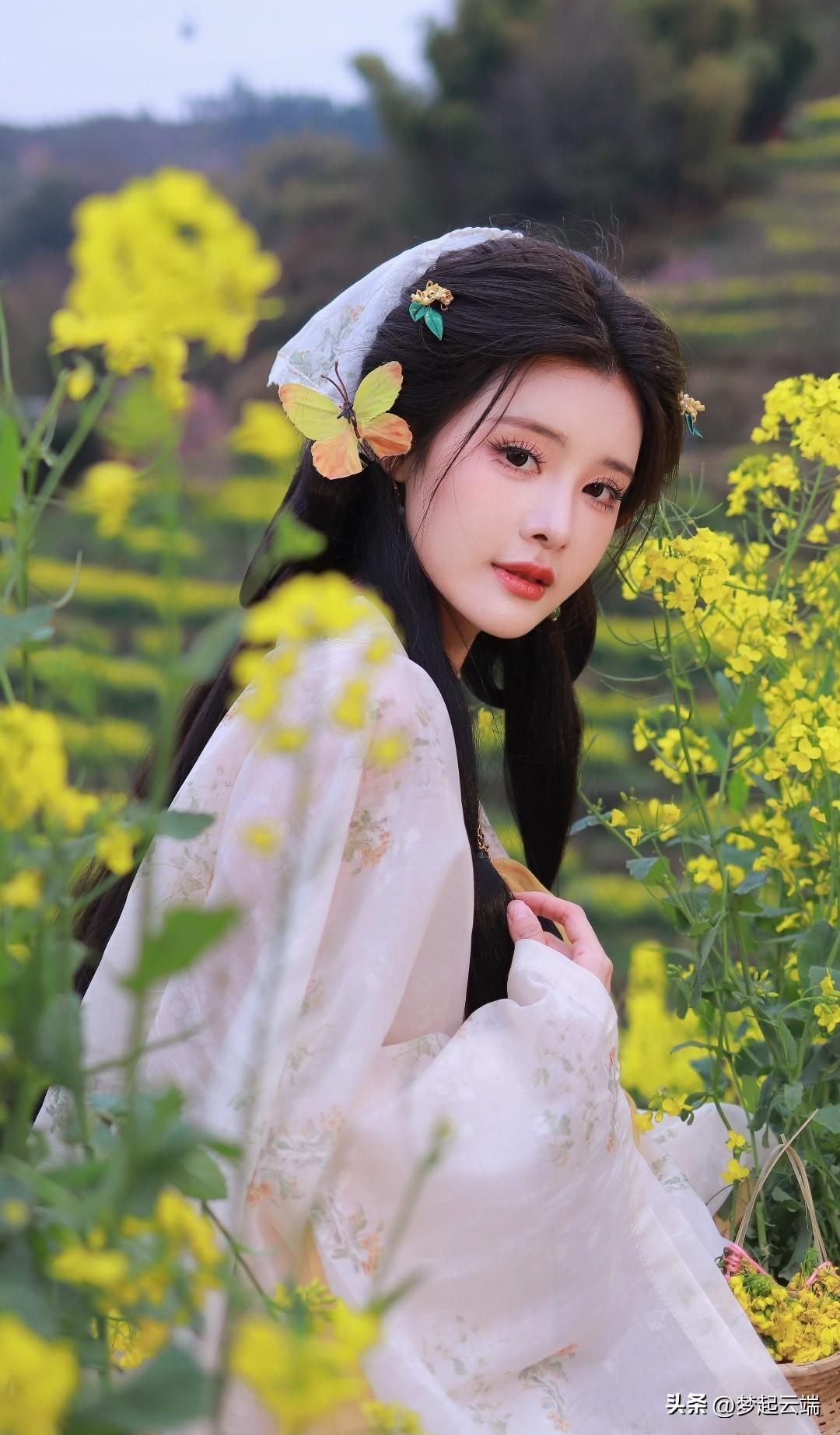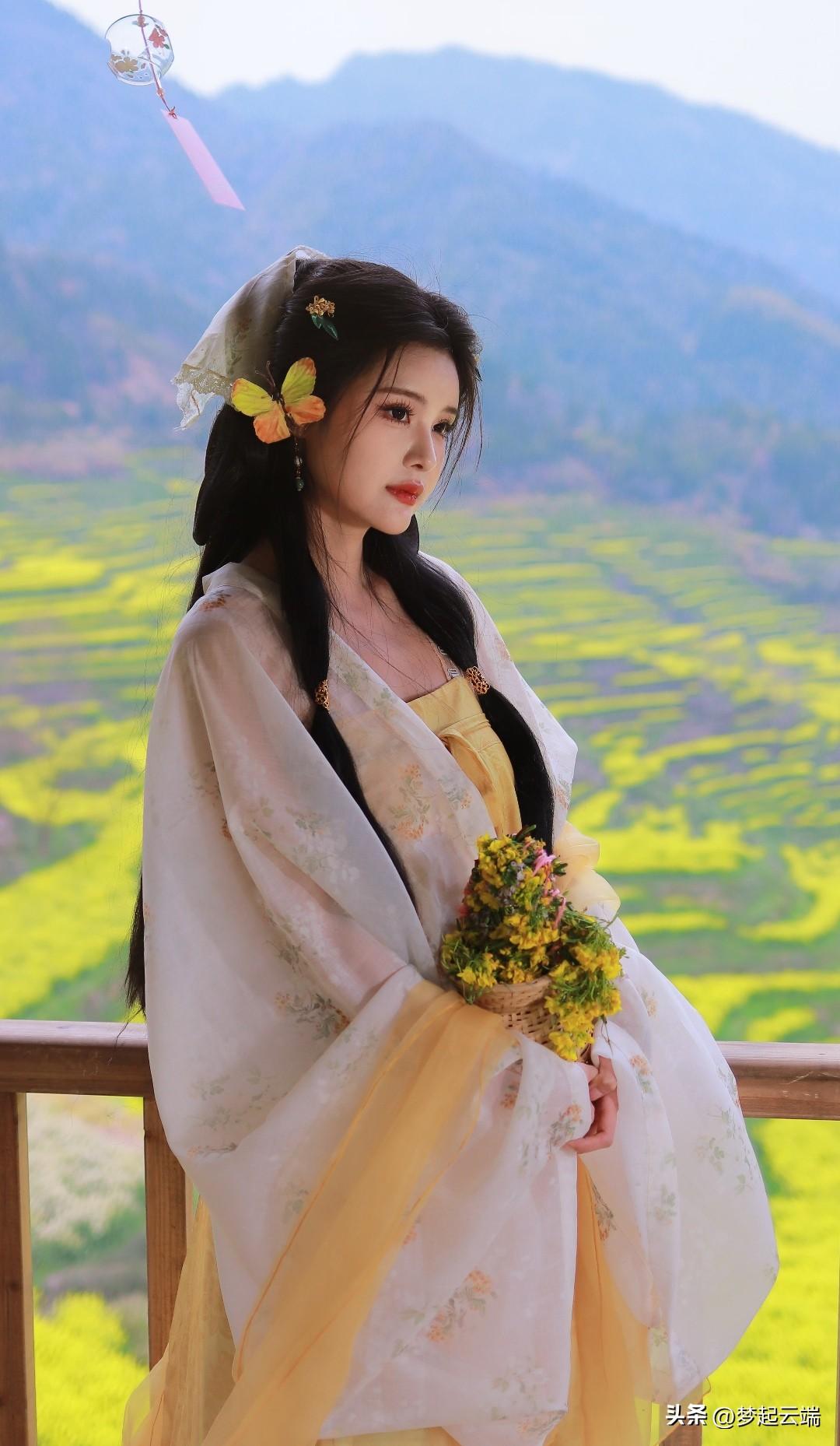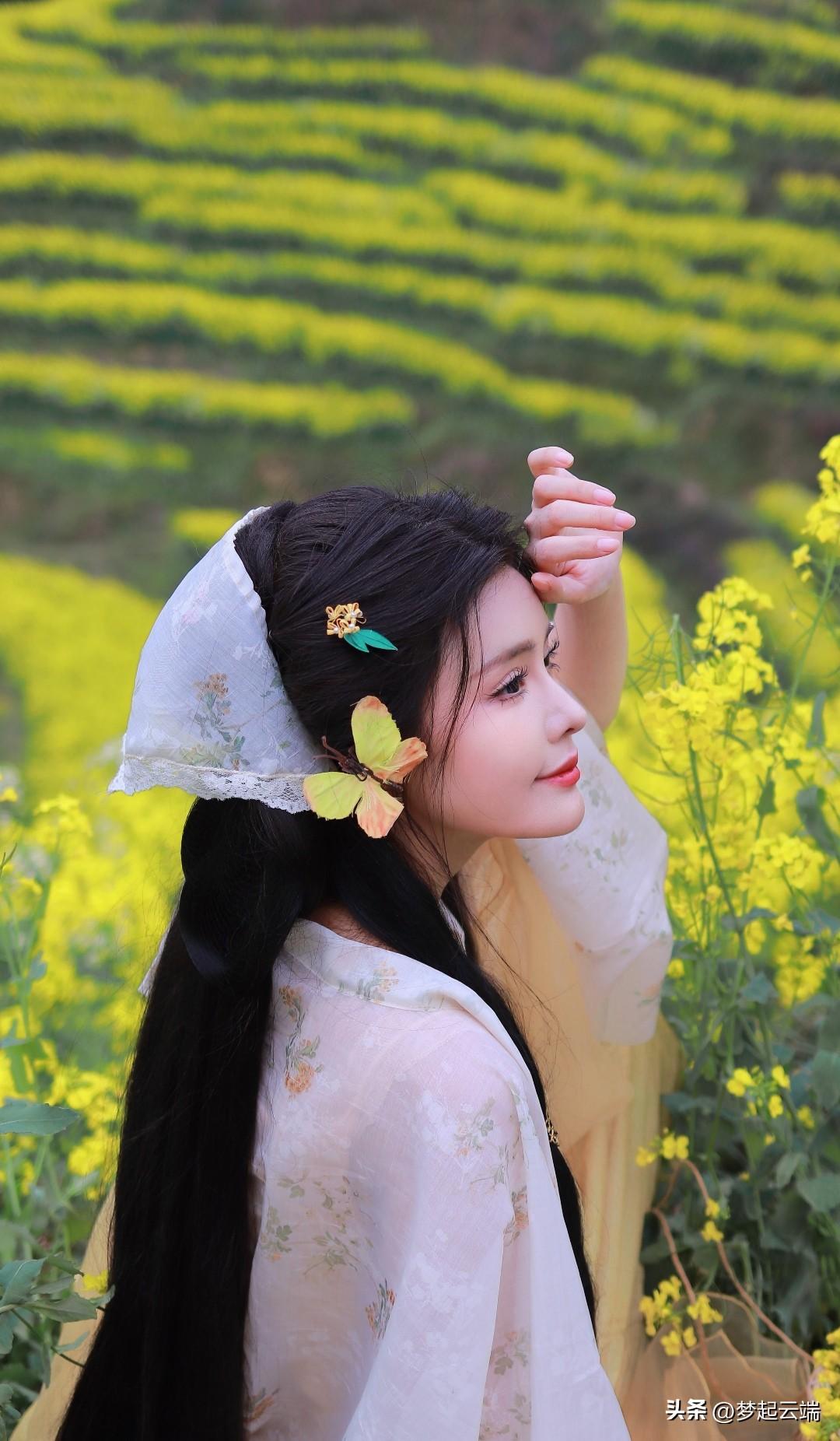 “春日田园中的古典美人,菜花相伴,韵味悠长。”🌸🍵🌿
