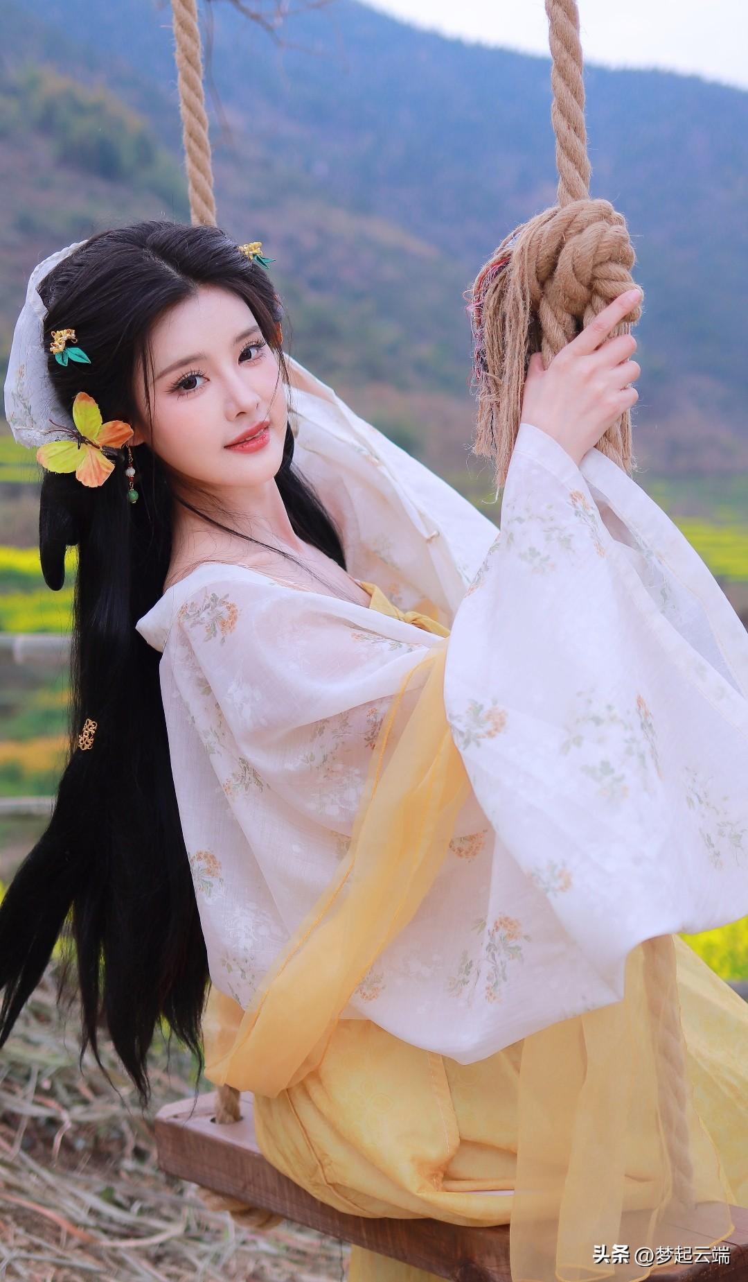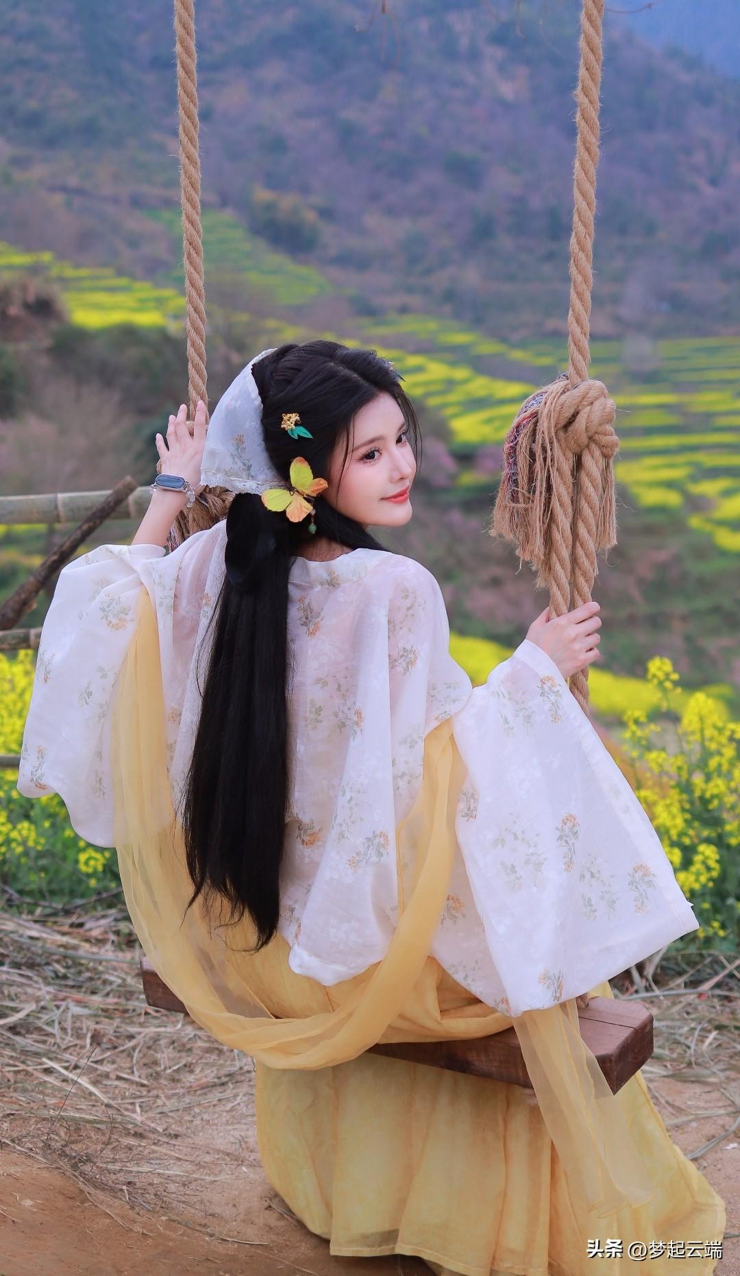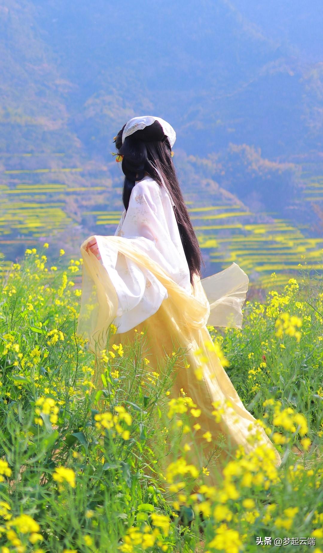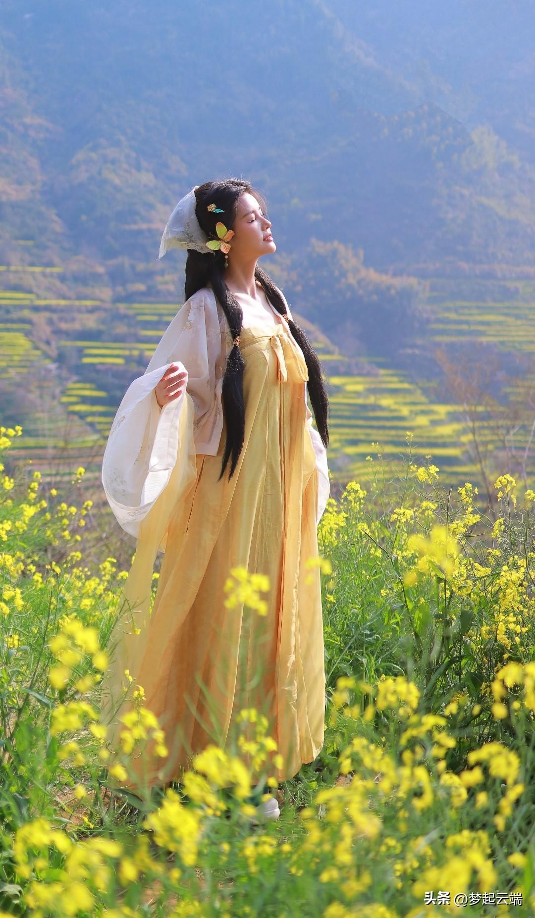 “春日田园中的古典美人,菜花相伴,韵味悠长。”🌸🍵🌿