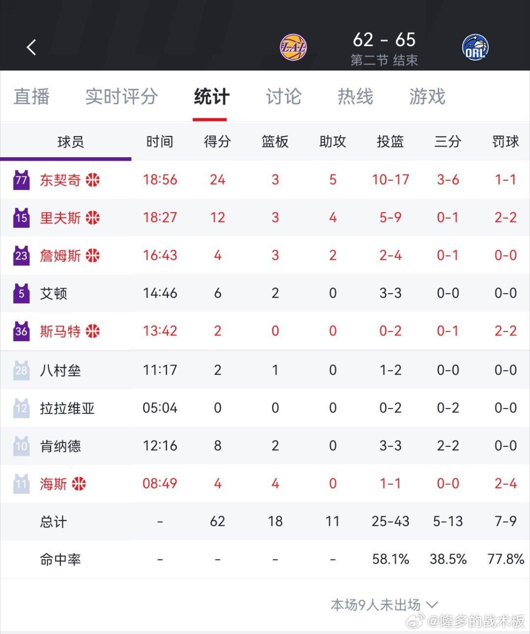 半场湖人62-65魔术,今天裁判有点过分,不让湖人队好过。 魔术不愧是湖人苦主,东契奇今天估计得拉满了。湖人一直靠东契奇的无解得分,半场才落后3分。 不过今天詹姆斯又刷新一项纪录:常规赛出场次数独占历史第一。