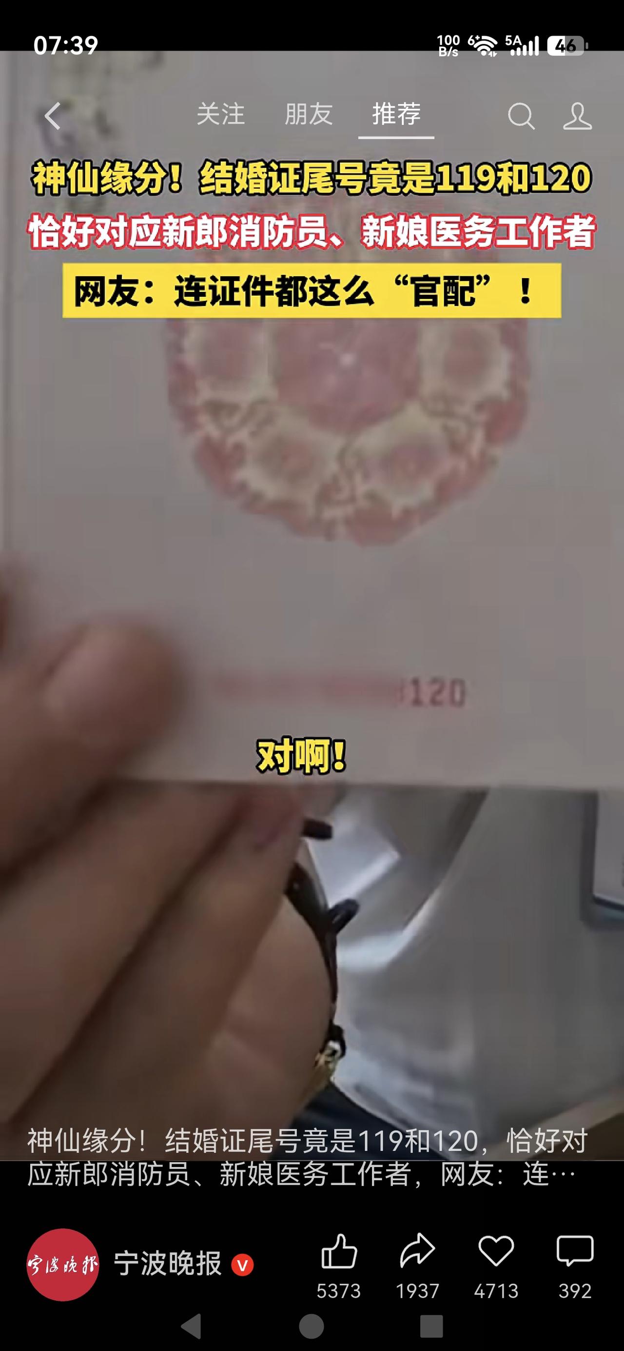 《119遇上120,这才是真正的“神仙CP”!网友:连救护车都在撒糖》 辽宁丹东一对新人领证,新郎是消防员、新娘是医务工作者,结婚证尾号竟随机抽到119与120,民政局证实未刻意挑选。两个守护生命的职业,遇上专属职业编号的巧合,全网直呼天选官配,瞬间刷屏温暖无数人。 这哪是巧合,分明是上天盖章的缘分!别人拼颜值拼家境,他们拼的是使命与担当。119赴汤蹈火,120争分夺秒,平日里各自守护一方平安,如今把守护变成相守,连证件都在为他们祝福。 很多人说爱情要轰轰烈烈,可最动人的浪漫,从来是懂你的辛苦、撑你的坚守。消防员常常逆行出征,医护人员日夜连轴转,他们比谁都明白责任二字的重量。这份缘分,是双向奔赴的温柔,更是志同道合的默契。 生活总在制造不期而遇的温暖,平凡岗位上的他们,用坚守与善良,收获了最甜的惊喜。愿这对新人平安顺遂,一生被爱,也愿所有默默守护的人,都能遇见属于自己的圆满。热点话题 119遇上120这才是天定良缘