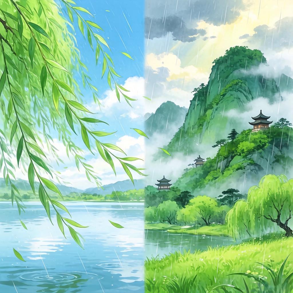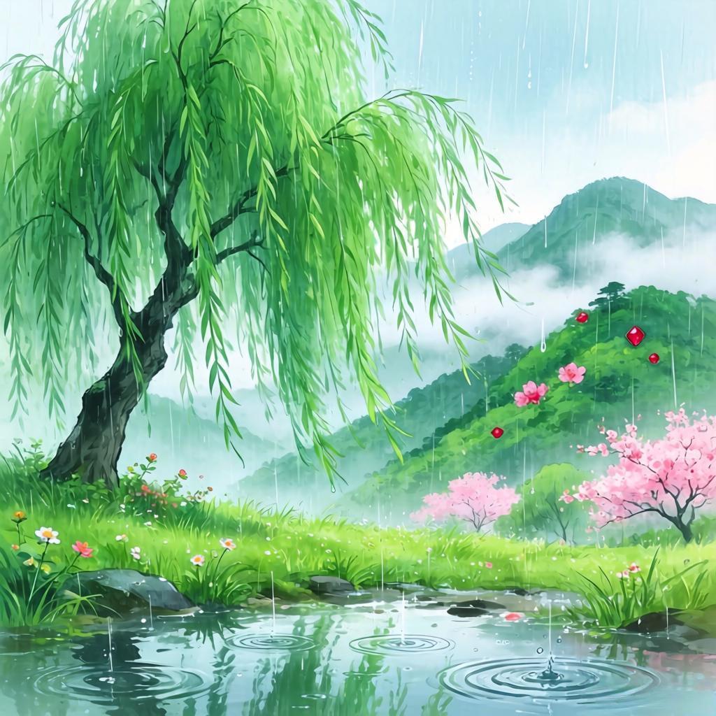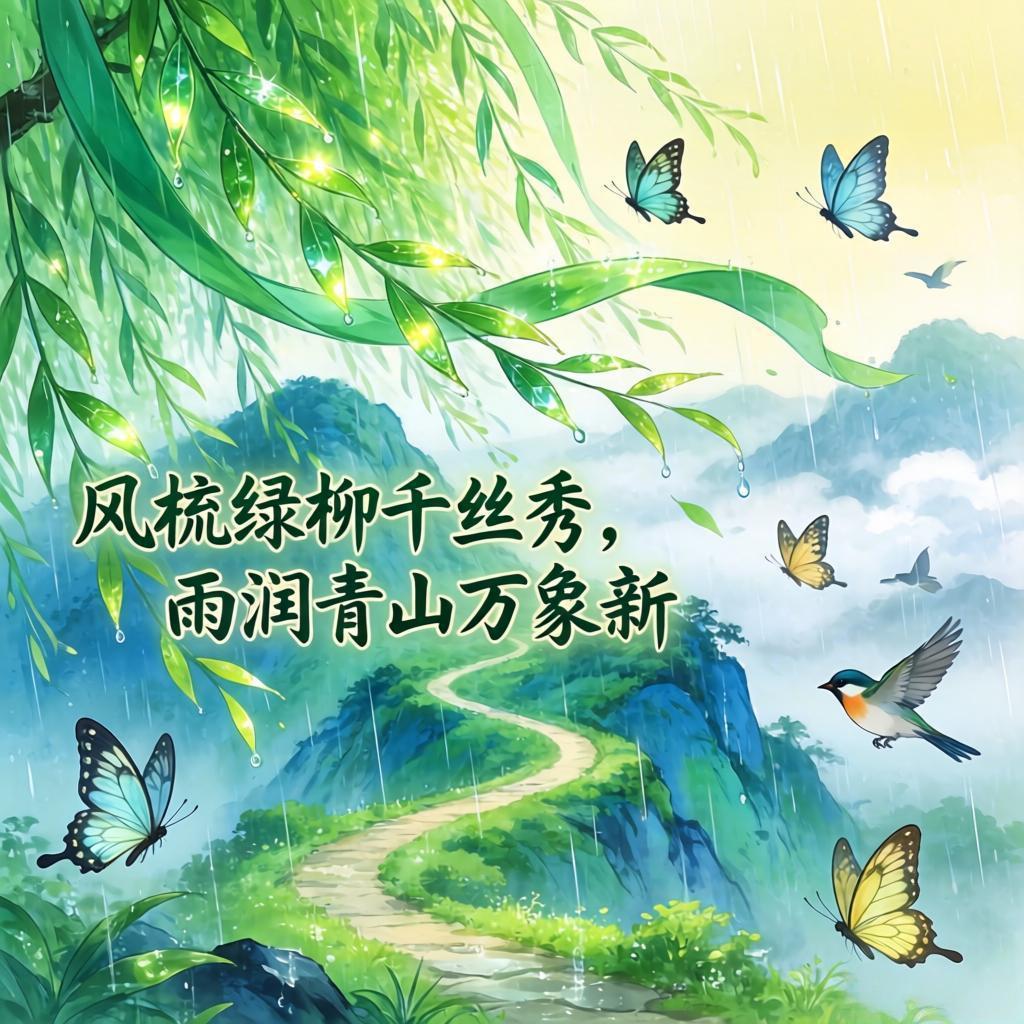 上联:风梳绿柳千丝秀 下联:雨润青山万象新