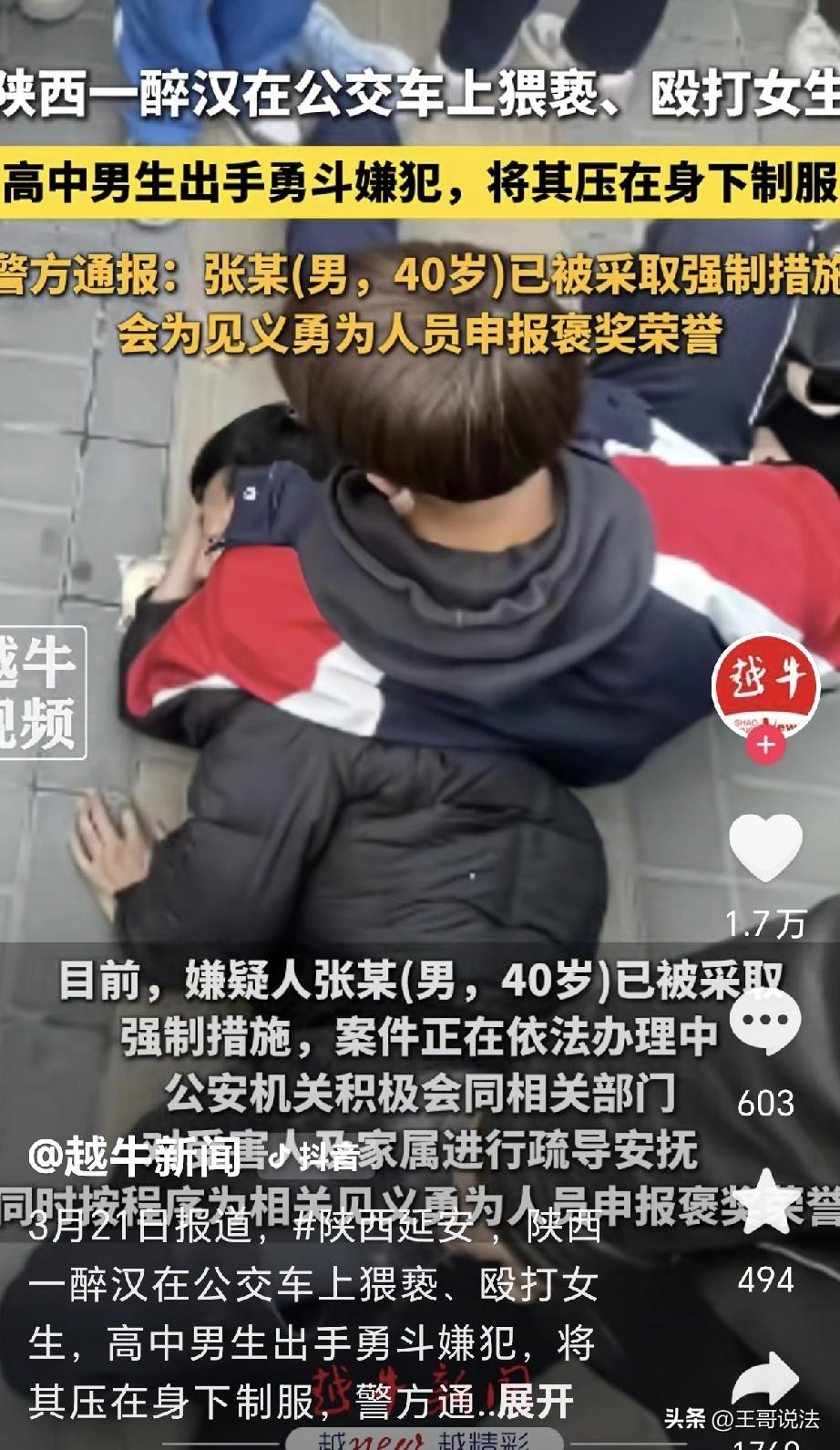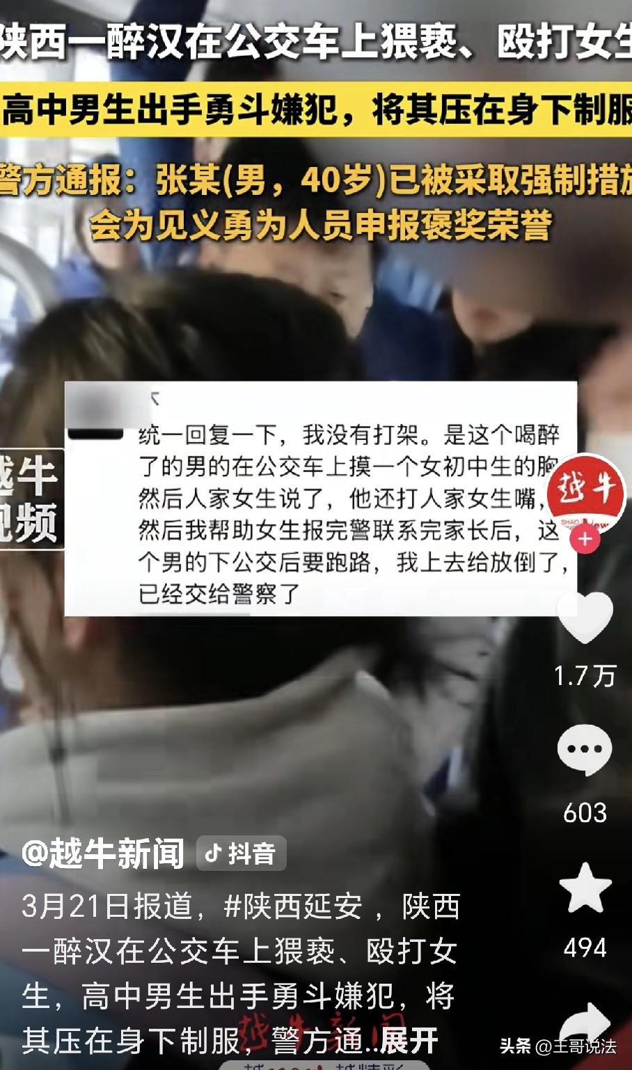 自古英雄出少年!陕西延安,一辆挤满学生的公交车上,一醉汉伸手摸一女生胸,女生呵斥他,醉汉一巴掌打女生嘴上,一高中男生立刻冲过来挡住女生,男生大喊: 司机别停车!随后报警,又给女生家长打了电话,醉汉怕了,眼看到站,醉汉下车就跑,男孩二话不说,扑上去将他撂倒,死死压住他不肯放手,结果令人意想不到。 一高一男生发朋友圈: 统一回复一下,我没有打架,是这个喝醉了的男的在公交车上摸一个女初中生的胸,然后人家女生说了,他还打人家女生嘴,然后我帮助女生报完警联系完家长后,这个男的下公交后要跑路,我上去给放倒了,已经交给警察了。 原来,男生每天放学,都要坐一辆公交车回家。 这天下午,他和往常一样,上了公交之后,发现车上大部分都是学生。 谁知这时,车上有个男子,他醉眼朦胧,一看就是喝多了的模样。 公交车一路晃荡,路上人多车多,公交车慢慢的往前开着,谁知这时,醉汉发现旁边站着一个初中女学生。 醉汉不怀好意,伸出手就摸女生胸,女生猝不及防,对醉汉大声呵斥! 谁知醉汉看她是个小女生,立刻有恃无恐,他双眼一瞪,你敢骂我?他挥起一掌,一巴掌打到女生嘴上。 女生立马委屈的要哭,旁边有一位女士义愤填膺: 我也是学生家长,你这样欺负人家娃娃,你走不了!立刻报警! 这一幕刚好被男生看到,他一步冲了过去,立刻挡在女子和醉汉中间。 男生大声呼唤司机: 不要停车! 随后他拿过女生手机首先报警,又给女生家长打了电话。 醉汉一看,心里害怕,他跳下公交上就想开溜!跑了。 谁知这时,男生一个箭步冲下,上前将醉汉撂倒,压住醉汉让他不能动了! 这时警方赶到,男生才放醉汉起来,谁知醉汉死不认账,说他没有猥亵,还说是女生骂他了,所以他才会打女生嘴巴! 警方调取了监控,发现当时人太多,监控上看不到关键的画面。 可是醉汉不要高兴的太早,当时车上很多学生都拿出了手机在拍摄。 目前警方还在进一步调查,说不定哪位同学就会拍到了醉汉猥 亵打人的那一幕! 目前,案件还在进一步调查处理中,学校表示已知晓此事,后续可能会对男生进行表彰。 醉汉嚣张,趁着酒劲在众目睽睽,他无所顾忌,故意摸初中女生胸,还动手打女生嘴巴,完全符合“猥亵他人+公共场所+侵害未成年人”的情形。 喝酒并不能当免责理由,不管你醉没醉,只看有没有干违法的事。 即便他不承认自己做了违法之事,即便监控没拍清也不怕。 车上有学生拍的视频,也有周围人可以作证,他赖不掉,也跑不了,等待他的是法律的严惩! 有人担心,男生将醉汉撂倒,醉汉会不会反咬一口? 大家尽可放心,男生上前制止并控制醉汉,属于正当防卫和见义勇为! 《民法典》第184条规定: 自愿紧急救助别人,就算不小心造成损害,也不用担民事责任。 男生看到女生被欺负,先挡在中间,还让司机别停车,之后又报警并联系家长,全程都是在保护被打的女生。 醉汉逃跑时男生上前撂倒,是为了抓住醉汉不让他跑,并将他交给警察。 在这期间,没有多余伤害,既没超过必要限度,也不是打架斗殴,因此无论怎样,男生都不会承担责任。 学校表示,会对男生予以表彰! 对此,你怎么看?