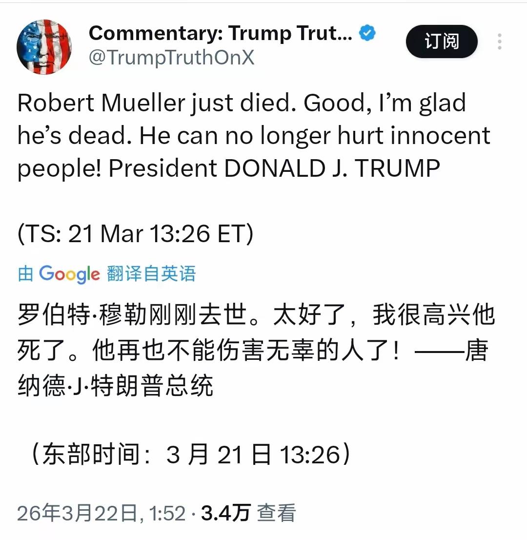 匪夷所思!多家外媒报道,前FBI局长、“通俄门”特别检察官罗伯特·穆勒去世,特朗普却发文道,“太好了,我很高兴他死了。”咱们有句话叫“人死为大”,过往的恩恩怨怨都会随着生命的逝去而烟消云散。但是,特朗普竟然公开表示“很高兴”,实在令人觉得匪夷所思了些!就说作为一名美国总统,不应该为一位美国人的逝去而悲伤吗?太没有下限了!