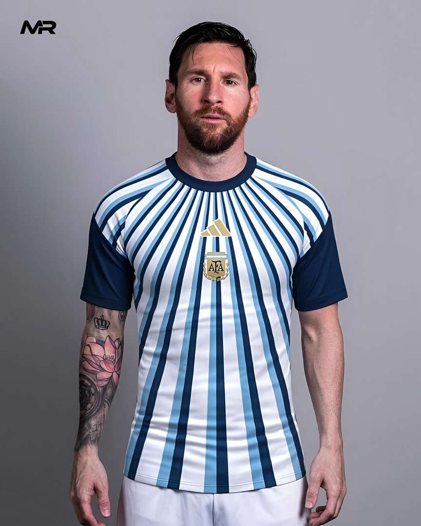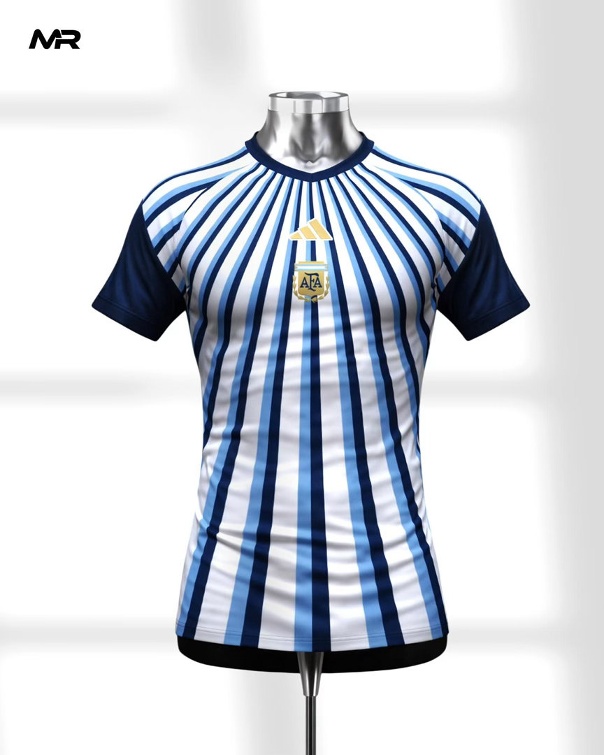 👕阿根廷队新款赛前热身服上身效果图🇦🇷你喜欢吗?白色作为底色,搭配不同深浅的蓝色竖条纹呈放射状对应标志性的“五月太阳”,既增添了现代感,又未偏离经典风格。深蓝色袖子为整体造型营造出对比与平衡。强烈的形式感视觉效果。⚽️