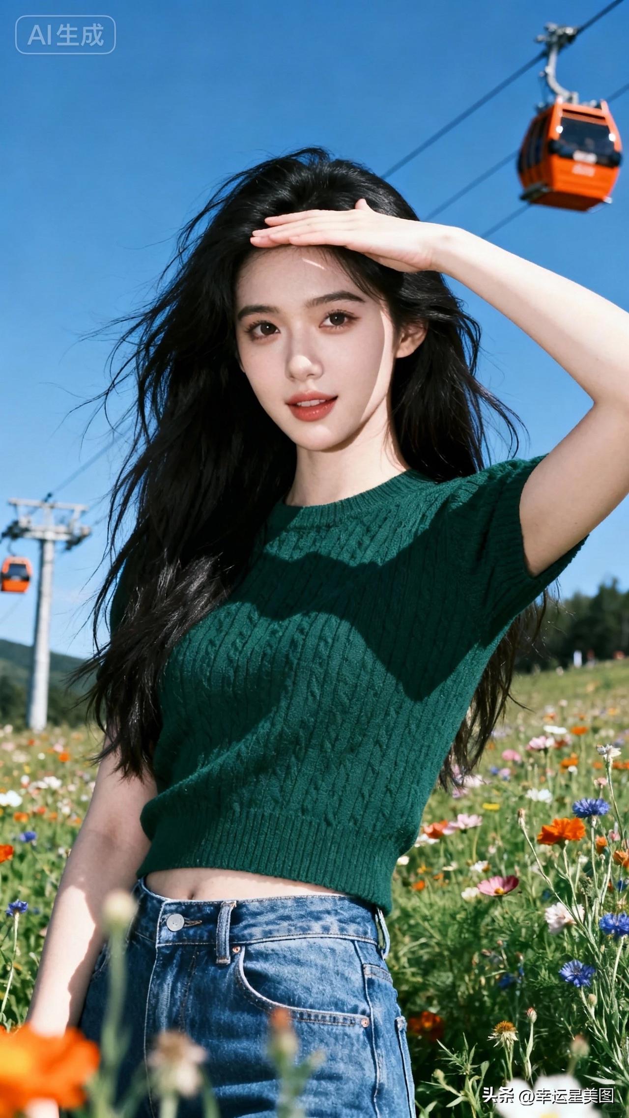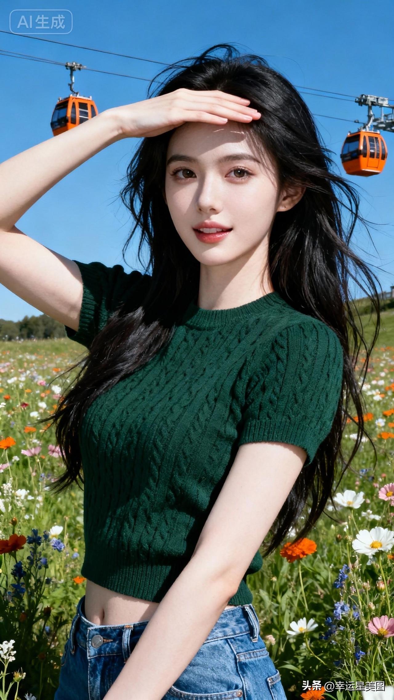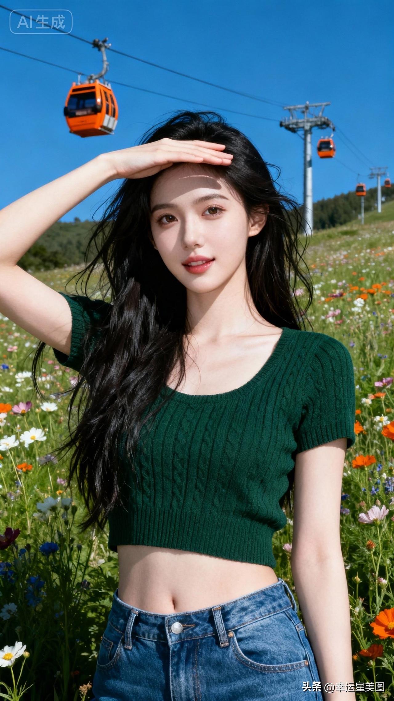 在花海中,少女与缆车相伴,尽享美好时光。