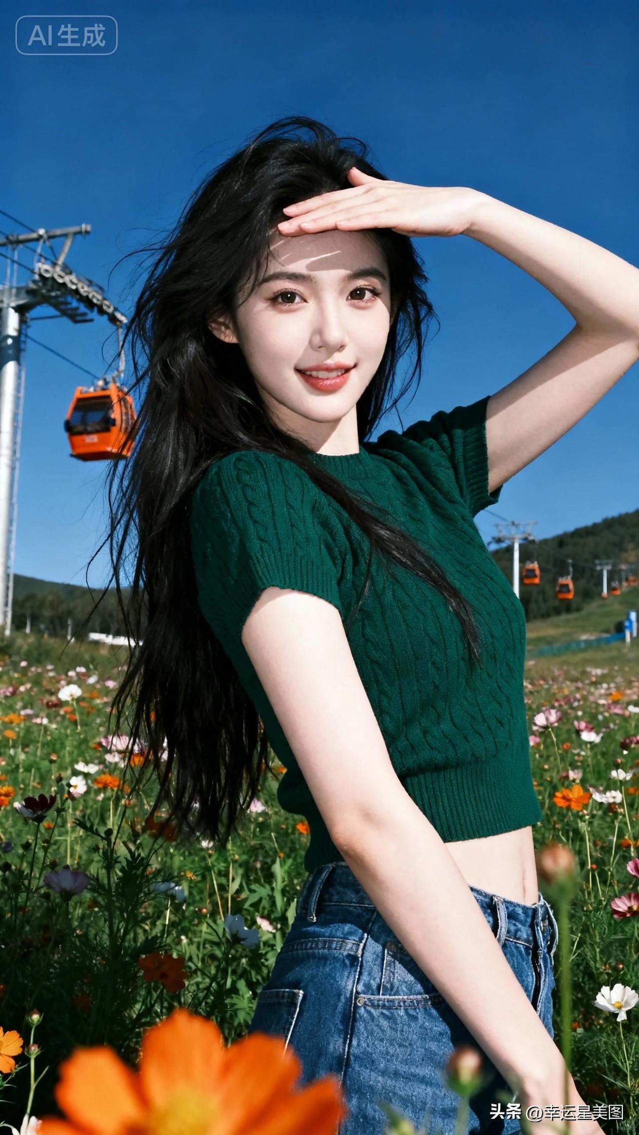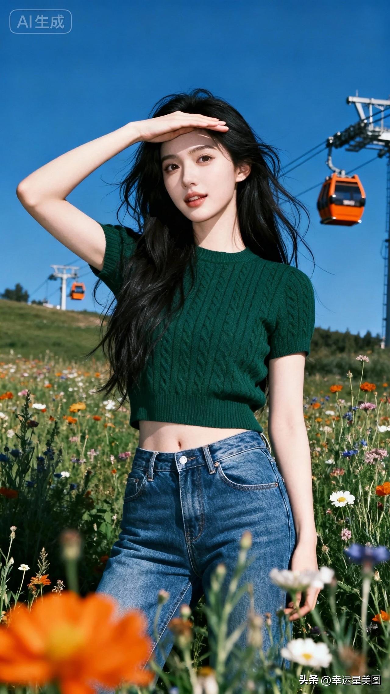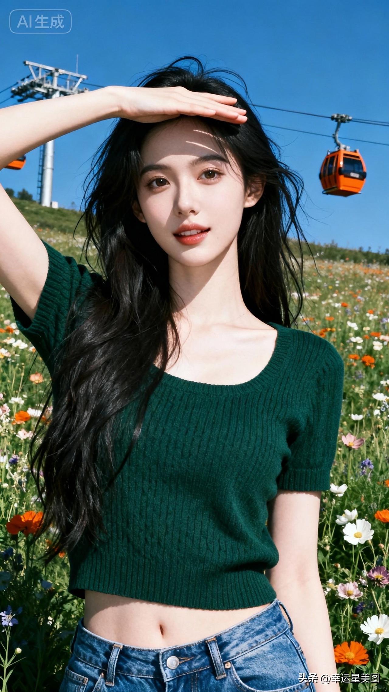 在花海中,少女与缆车相伴,尽享美好时光。