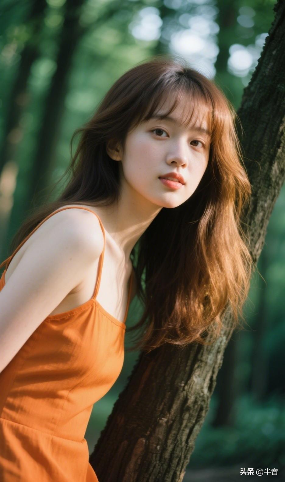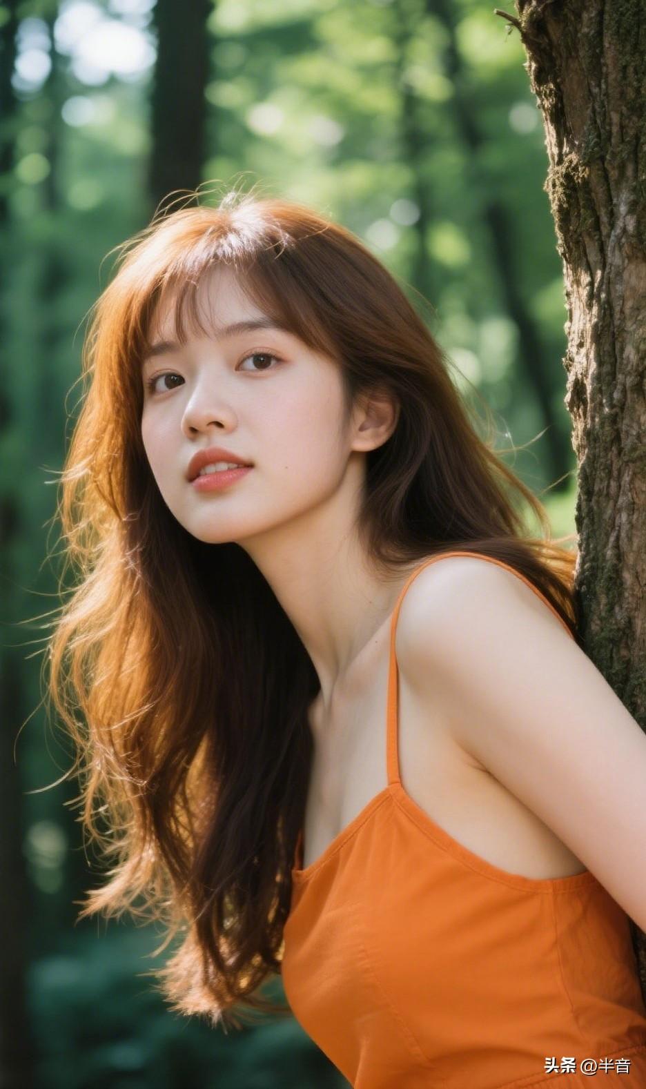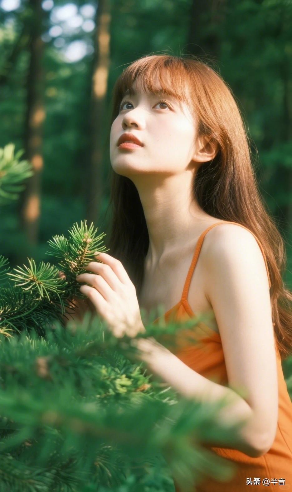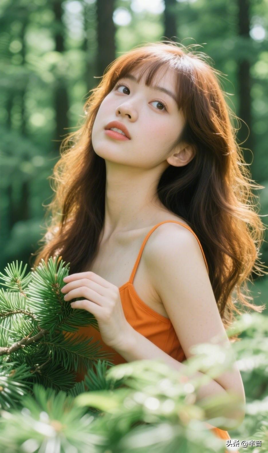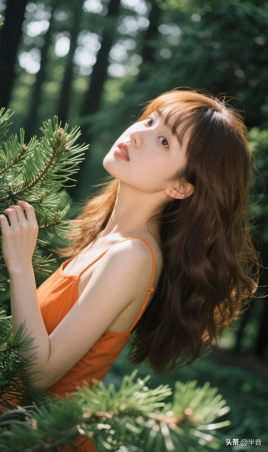 “在森林里捡到一束光✨ 橘色吊带撞进满眼绿意 风里都是松针的清香
