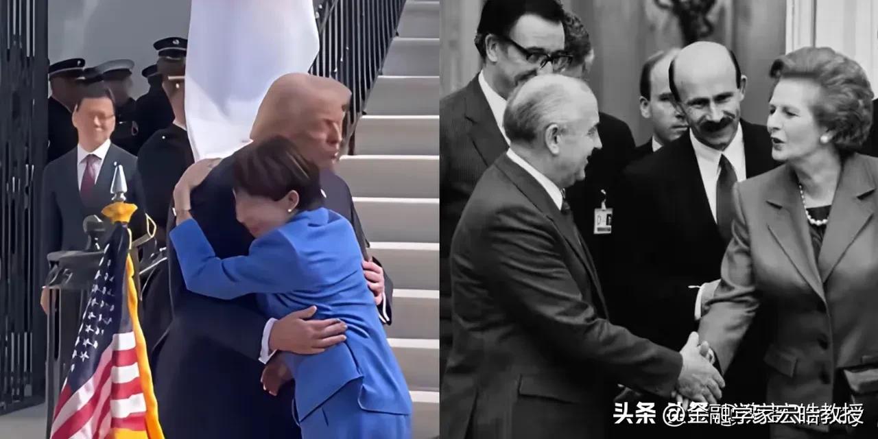 高市早苗模仿得了撒切尔夫人的穿搭,模仿不了风骨! 1975年,英国前首相撒切尔夫人首次以保守党领袖身份访美,与福特总统平等对话,一身蓝西装气场全开,是能和美国掰手腕的“铁娘子”。 如今高市早苗刻意模仿同款蓝西装、珍珠项链,连发型都在复刻,可白宫合影里,她低头弯腰、满脸谄媚,和特朗普主动拥抱时姿态卑微到尘埃里。 撒切尔夫人的蓝西装是主权的铠甲,高市早苗的蓝西装只是讨好的戏服。 同样的蓝西装,高市早苗模仿得了穿搭,模仿不了脊梁!这就是政治家和附庸的本质区别!
