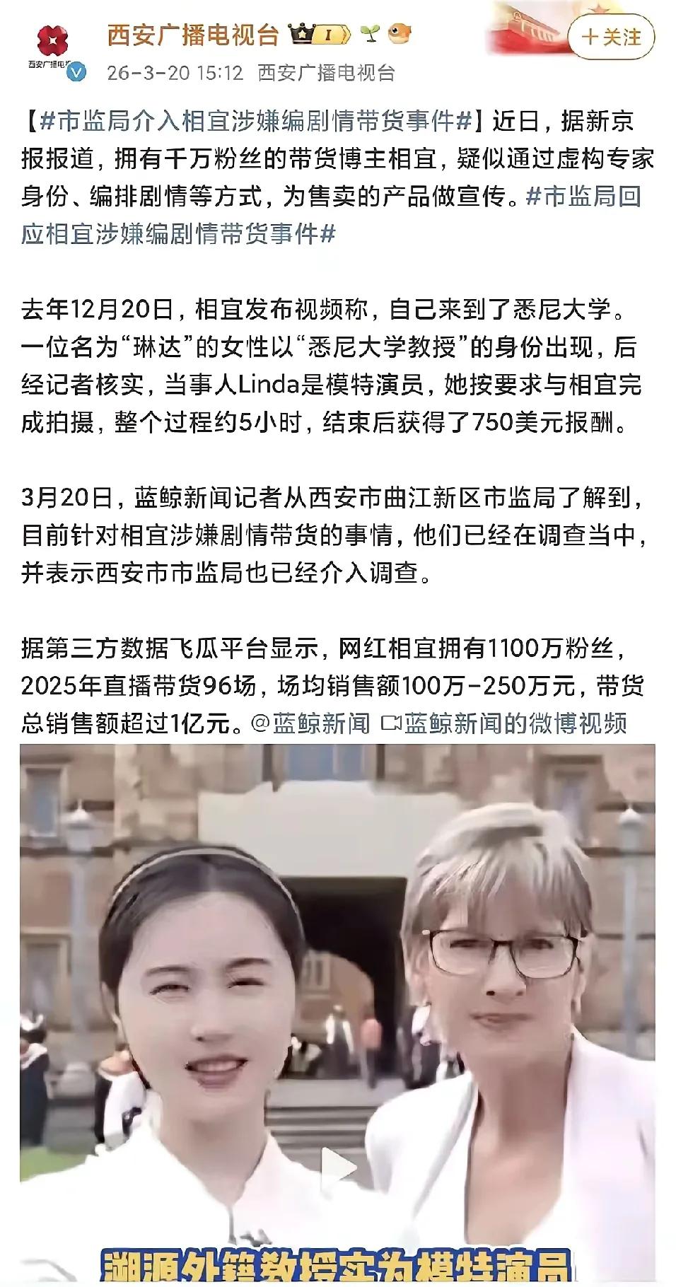 相宜博士还有退路吗?三个重点来了!她家乡的市场监督局,她家乡的媒体都在调查她了。 1、这一次,相宜被锤的原因想必大家都知道了,她的评论区也关闭了。 带货时编造剧情,让模特充当悉尼大学的教授,越扒越离谱。 2025年年底,相宜发布与佳思敏DHA产品相关短视频,她与大学教授走在校园里,用英文讨论DHA。 原来,她将模特Linda包装成“悉尼大学教授”为产品背书。 琳达穿着职业装,与教授表面上看不出有什么区别,没想到只是人设而已。 新京报报道时,提及琳达已经承认自己的身份,她的报酬是750美元。 相宜团队则认为,琳达是品牌方雇佣的,与他们没有关系,甩锅了,至于能不能甩掉,要看相关部门的定夺。 琳达则表示,我想相宜知道我是谁。 想必是经过精心排练的。 2、对此网友众说纷纭,一些人认为相宜违反了相关规定,假冒专业人员宣传产品,为了自己的小黄车,误导消费者。 也有人认为,只要产品质量没问题,可以睁一眼闭一眼。 不得不说,如今网红带货套路多,包括董宇辉,嘴上说自己是读书人,最不想带货,可是行动截然相反。 不反对带货,但是网红带货套路越来越多,作为购买者,普通百姓,无法辨别。 相宜一年一个亿的销售额,卖驼奶粉,都市丽人内衣时,都有托。 已经不是第一次了,铺垫,各种造假没眼看,一直在挑战大众的底线。 3、相宜平时在直播间絮叨,时起时落。 总是在抱怨,看着很压抑,家庭的矛盾,她对亲人的抱怨,时常出现,一个话题可以延续几年。 其次,她对婚姻观念,与大伙也是背道而驰,小烨总事件刚过,一波三折。 一波不平一波又起。