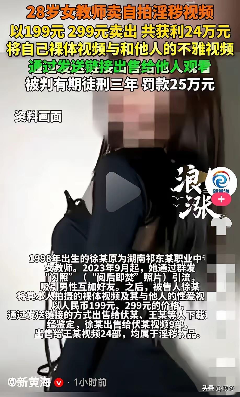 半年赚24万,结果把自己送进了判决书!好好的女教师不干,偏要卖不雅视频赚钱! 好好的铁饭碗不要,非要走歪门邪道,这脑子真是不知道咋想的! 上海这边刚判了一个案子,28岁的女老师徐某,为了赚快钱,居然在网上卖自己的裸体视频、性爱视频,199、299一份,半年狂捞24万,最后直接被判三年,罚了25万,一辈子的前途全毁了。 徐某是1998年的,才28岁,本来在湖南一所职业中专当老师,工作稳定、体面,说出去人人羡慕,可她偏偏就觉得上班来钱太慢,干活又辛苦,心里总惦记着走捷径、发快财。 从2023年9月开始,她就动了歪心思,在各种社交群里发闪照,阅后即焚,专门吸引陌生男人,一步步引流加好友,把人圈住之后就开始卖视频。 她自己拍私密视频,也拍和别人的不雅视频,明码标价,199、299元一部,直接发链接让人下载,一点底线都不留。她自己还心存侥幸,觉得拍的是自己的身体,不算侵犯别人隐私,更算不上犯法,可她根本不知道,只要以牟利为目的传播,就是触碰刑法。 就这么短短半年多,她卖给好几个男子几十部视频,光是卖给伏某9部、王某24部,后来一鉴定,全都是实打实的淫秽物品,非法获利整整24万多。 钱来得太容易,她越陷越深,可法网恢恢,真的疏而不漏。2024年5月,徐某直接被警方揪了出来,当场抓获。 好在她到案之后还算清醒,老老实实坦白了全部事情,主动把24万违法所得全退了,也提前缴了罚金,签了认罪认罚,法院也考虑到这些从轻情节。 可根据《刑法》第363条,制作、贩卖淫秽物品牟利,不是你说不懂法就能算了的。法院最后判她有期徒刑三年,缓刑三年,罚金25万,所有违法所得、拍视频用的工具,全部没收上缴。 我琢磨着,这事看下来真是又气又可惜。她一个人民教师,本该站在讲台上教书育人,为人师表,结果为了一点快钱,把道德底线、职业脸面、法律规矩全扔了。 现在倒好,工作丢了,案底留下了,一辈子背着犯罪记录,走到哪都抬不起头,本来光明坦荡的人生路,硬生生被自己的贪念给走死了。 现在好多年轻人都心浮气躁,总想着一夜暴富,总觉得踏实赚钱太慢,可世上哪有什么真正的捷径?看着是捷径,其实全是悬崖。 尤其是吃公家饭、干体面职业的人,更要守得住底线,别等真栽进去了,再后悔就什么都晚了。 大家说说,就为了24万,把教师工作、名声、前途全毁了,到底值不值?换成你,能理解这种为了快钱铤而走险的人吗? 信息源:综合裁判文书公开信息及网络官方通报整理