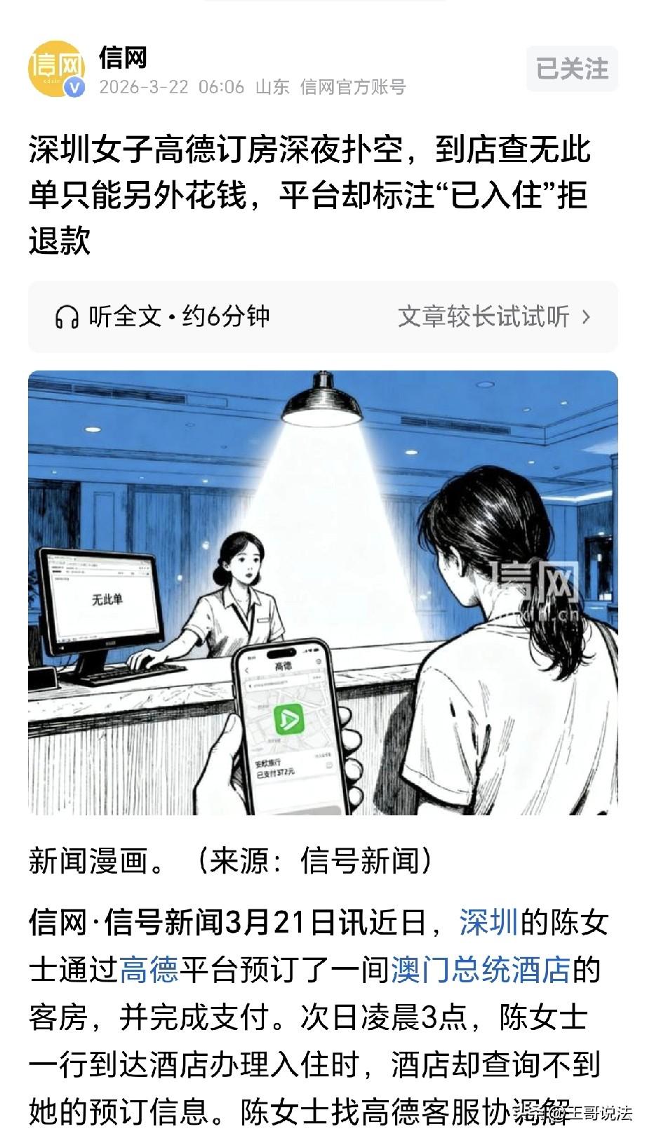 “吃相太难看!”广东深圳,一女子到澳门旅游,提前花了372元在平台订了酒店,谁知到了酒店,酒店却查不到女子的订单,女子无奈,只有花490元高价现场订房住了一晚,女子联系平台,平台答应给她退款,谁知女子回来后发现,订单显示已入住,钱也被扣走,女子又找平台客服,可客服提出,只能给她30%退款和50元优惠券,女子拒绝,只要求退款,平台又说,要她自己找酒店退钱,女子大怒: 我在平台上支付了房费,却没有享受到相应的服务,他们不应该退款吗? 凌晨三点,陈女士带着朋友,俩人拖行李箱来到了澳门总统酒店大堂。 陈女士长舒一口气,她满身的疲惫,就想立刻到房间休息。 原来,3月1日,高女士和朋友到澳门旅游,她做好了攻略,提前花372元在这家总统酒店下了一晚上的订单。 下了飞机,俩人迅速就赶到了酒店,谁知前台一句话,直接让她心凉到了嗓子眼:对不起女士,系统里根本没你的订单。 陈女士当时就懵了,她在平台上明明显示预订成功,钱也扣了,怎么到了酒店就没订单了? 她赶紧给平台客服打电话,可对方2小时后才给了回复。 客服表示,平台是跟第三方服务商合作的,现在人家还没上班,现在处理不了,事后平台会全程协助陈女士帮她退钱。 陈女士这时已经累的眼皮打架,最后只能咬牙在前台又掏了490元现款开房,才算能进入房间休息。 陈女士以为,事后就能按流程给她退款,这也许就是系统暂时出现了问题,只要把钱退了就算完事了,谁知后续更让人她气愤! 等陈女士旅游完毕,回到了家里,她拿出手机,发现订单竟然显示她已经入住,372元也被扣走了。 陈女士急火攻心,她在入住时,酒店没查到订单信息,是陈女士另外掏钱又付了一次房费。 如今平台不但不给她弥补多花的钱,反而还要再扣走一份钱?天下哪有这样的道理! 陈女士立刻打电话联系客服,可这个时候,平台话又变了! 平台当初答应等回来后给陈女士全额退款,可是现在,又说退30%加50元券。 陈女士急了,我只要钱,我要你优惠券做什么,下次旅不旅游还不知道,你给我退钱! 可是平台话风一转,竟然让陈女士自己去找酒店退钱。 陈女士气乐了:我是在酒店现场订房和付款,人家已经完成了服务,凭什么再让我找酒店退钱? 而我是在平台上支付了房费,却没有享受到相应的服务,难道平台不应该退款吗? 更离谱的是,当陈女士想找那个所谓的第三方服务商理论时,平台不肯透露服务商信息。 这种“我卖票,出事找别人,但我还不告诉你别人是谁”的操作,简直把陈女士给气坏了。 并且酒店还表示,他们并没有和这家平台直接合作,而是只和部分旅行社有过合作。 平台客服也向媒体证实:并未与这家酒店直接合作,订单是由第三方服务商承接的,款项也是由平台与服务商结算。 可是,平台就是拒绝告诉陈女士服务商的具体信息,还说退款必须等服务商同意后才能操作。 令陈女士更生气的是,服务商没说拒绝也没同意退款,订单就卡在了处理流程,陈女士急坏了。 之后,平台回复,说平台的专员正在代为沟通。 这事看起来绕弯,实际非常的简单,陈女士是在平台上下了订单,既然这个订单没找到,也没有使用,平台就该立刻退钱! 从法律角度看,这事儿一点都不模糊。 《消费者权益保护法》第44条规定,消费者通过网络交易平台购买商品或者接受服务,其合法权益受到损害的,可以向销售者或者服务者要求赔偿。 也就是说,平台收了钱就得负责到底,即便是第三方提供的服务,平台也有义务提供真实的联系方式。 如果提供不了,平台就得先赔钱给陈女士,然后再自己去找服务商算账。 《民法典》第577条规定,当事人一方不履行合同义务或者履行合同义务不符合约定的,应当承担继续履行、采取补救措施或者赔偿损失等违约责任。 陈女士付了钱没房住,平台不仅违约,还虚构入住事实,吃相太难看。 之后平台还在那儿推委,说订单状态是已离店,退不退得看服务商是否同意。 这种把责任一推到底的做法实在令人气愤不已。 好在事后不久,陈女士反馈,媒体介入后,平台已经向陈女士退还了372元订房款。 对此,你怎么看?