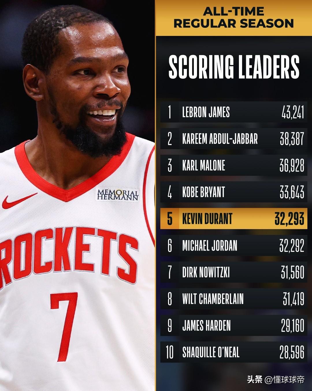 长江后浪推前浪,杜兰特总得分超越乔丹把乔丹挤出了历史前五! 在今天火箭与热火的比赛中,杜兰特全场17投9中拿到了27分,带领火箭绝杀热火,同时职业生涯总得分也超越了乔丹,排名历史第五,可以说双喜临门了。 真的是长江后浪推前浪啊,乔丹退役的时候,总得分还是历史第二仅次于贾巴尔,没想到才短短二十几年过去了,总得分先后被马龙,科比,詹姆斯和杜兰特超越,看来以后估计连历史前十都保不住了。 杜兰特要是没有因为伤病赛季报销一年的话,现在总得分已经超越了科比了,等杜兰特退役的时候至少可以超越马龙排名历史前三了,想要超过贾巴尔则基本上没有希望了。