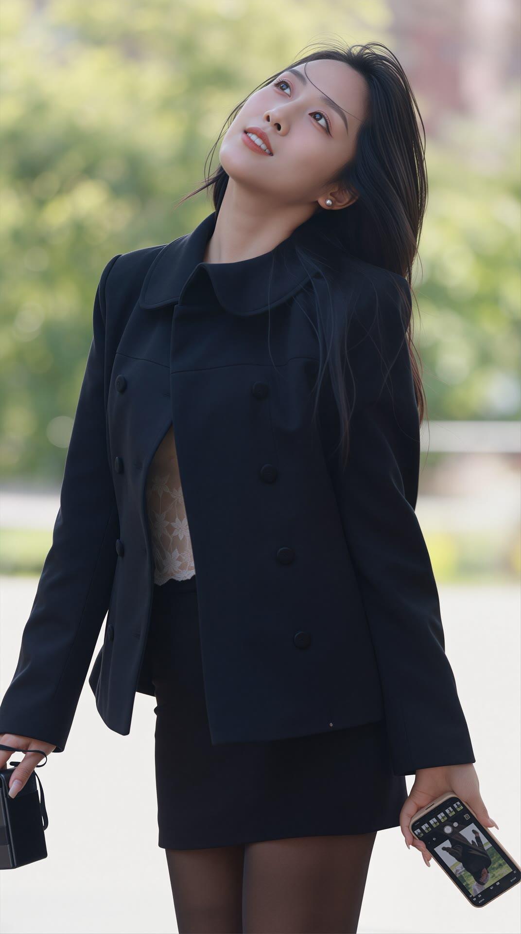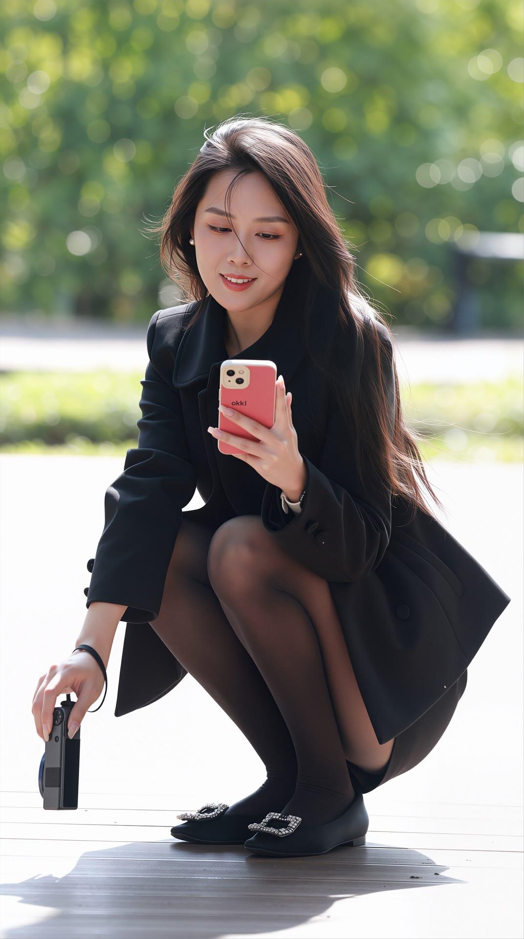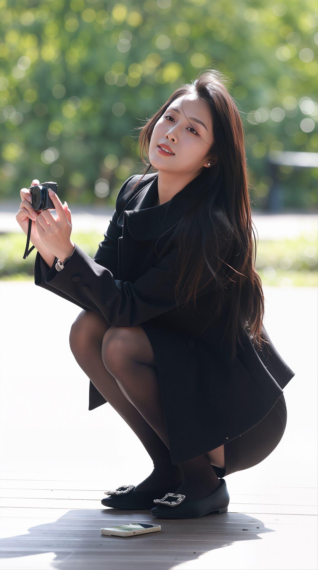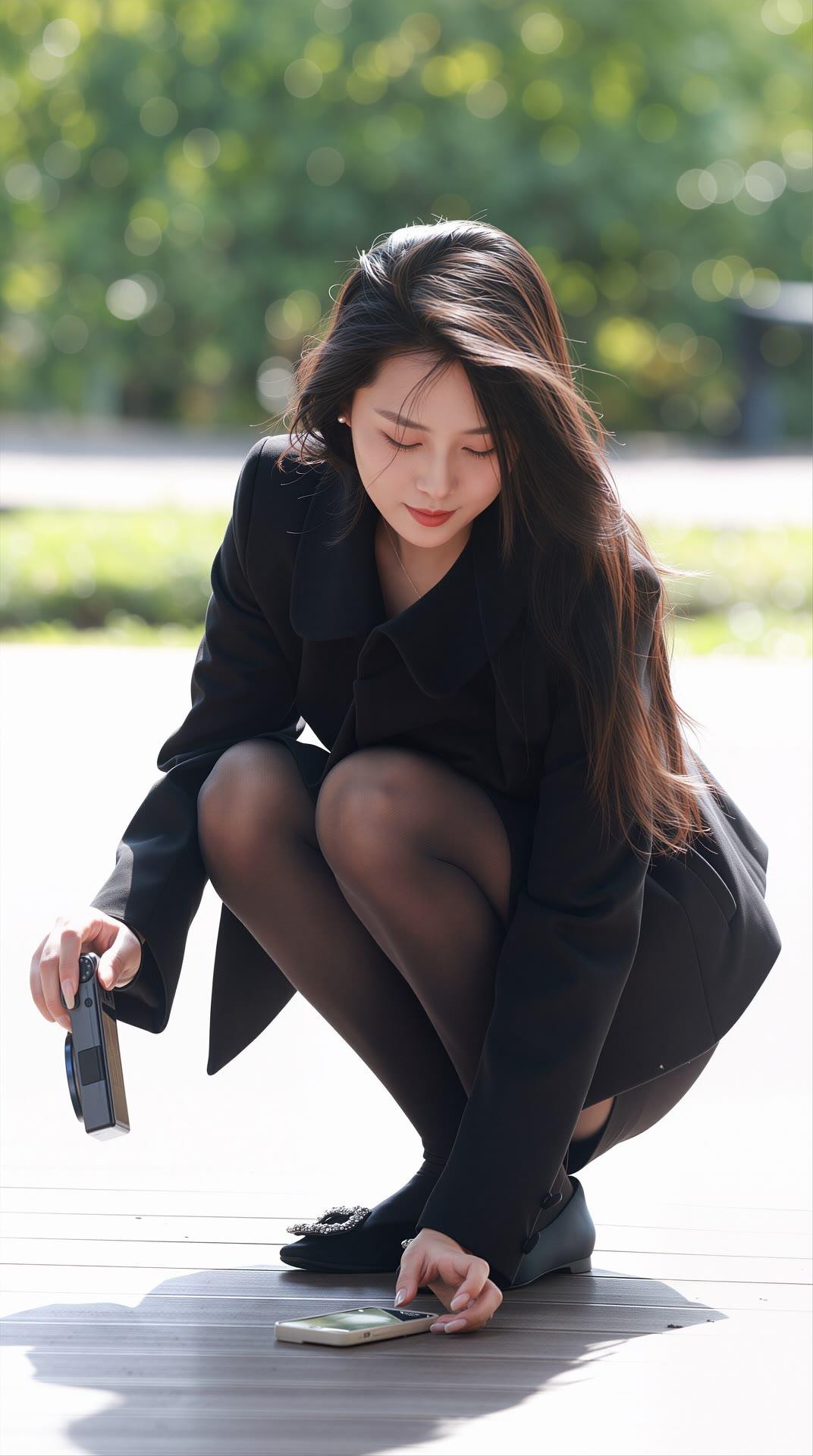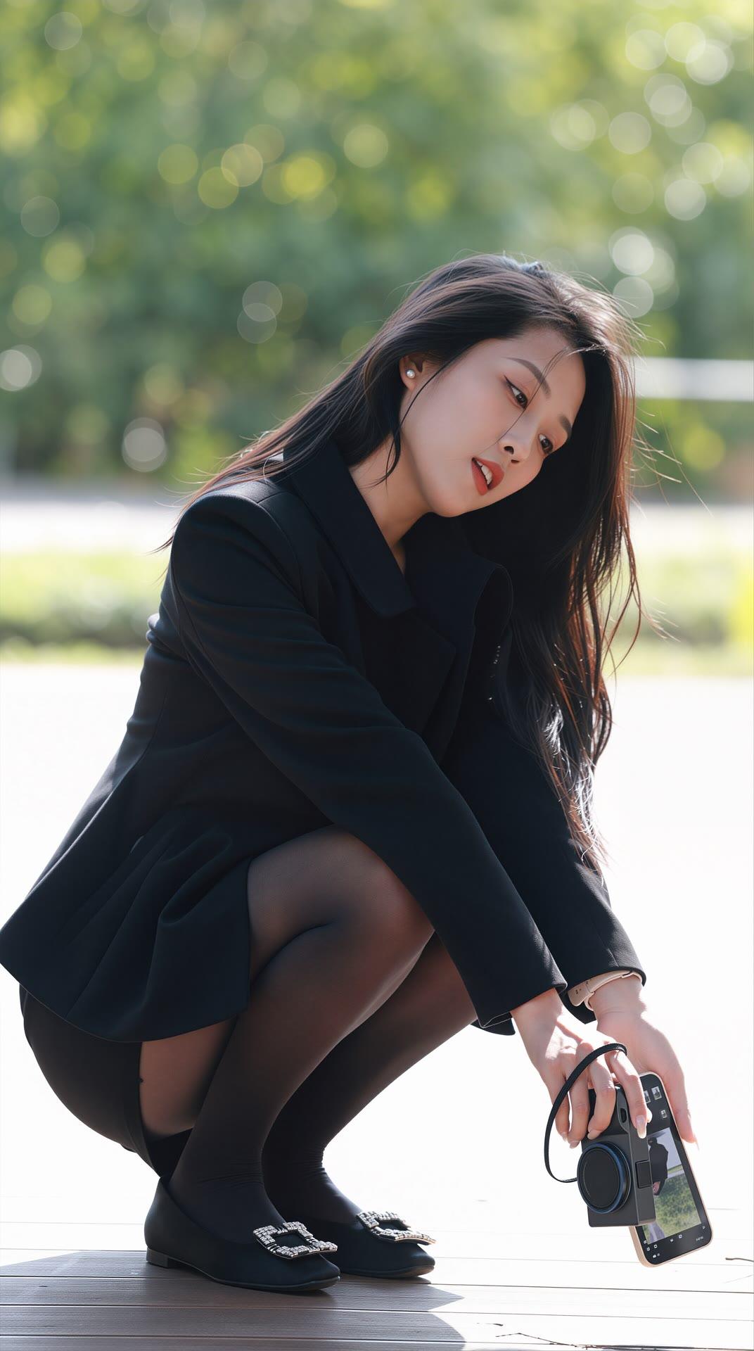 优雅黑裙少女,阳光下的甜美瞬间