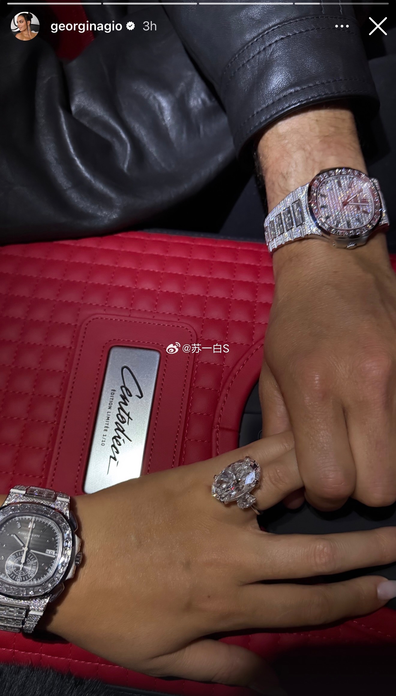 被乔治娜晒的照片闪到👇她的大钻戒、C罗的大钻表,还有布加迪威龙🙉