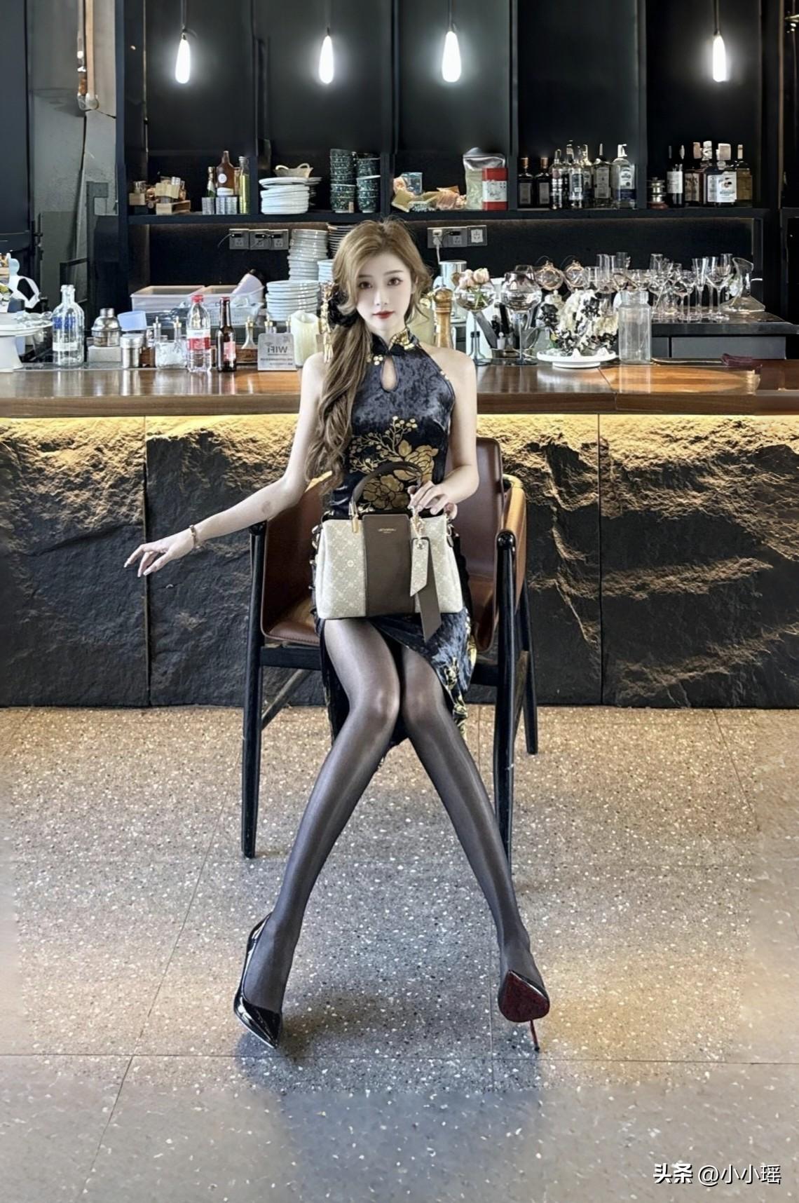 分享ootd穿搭 咖啡馆随拍一组,一席黑金旗袍配黑丝加红底高跟,波浪卷发,气质这