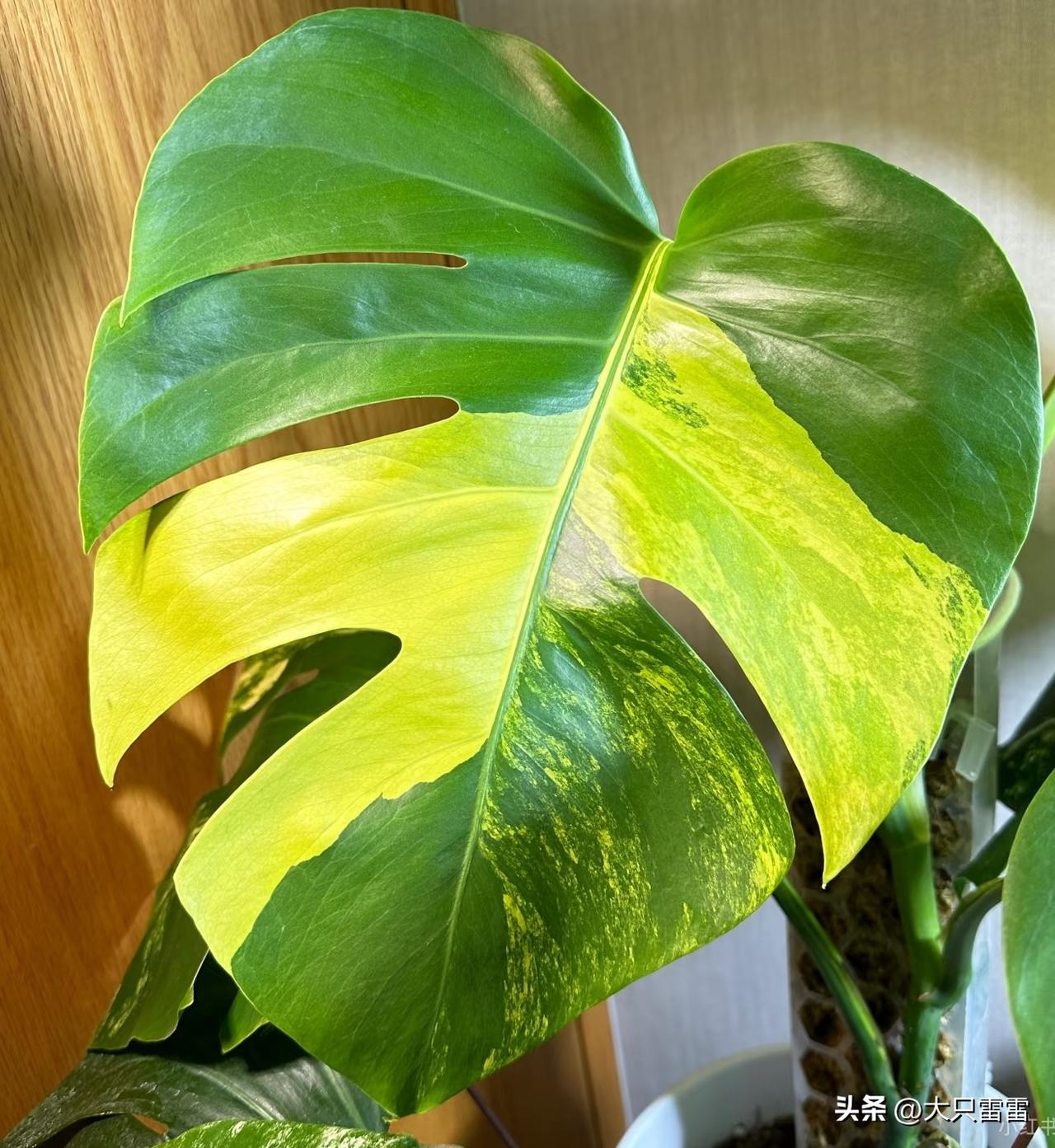 黄锦龟背竹有点神奇。 刚长出来的叶子是青色的,慢慢叶子就开始显色了。有锦部分的黄色越来越浓。 以前黄锦龟背竹一片叶子就上千块,现在几十块就可以拿下了。 不管是什么稀罕的植物也好、水果也好,只要有利润赚,几年时间咱们国人就能将它变成地摊货! 龟背竹