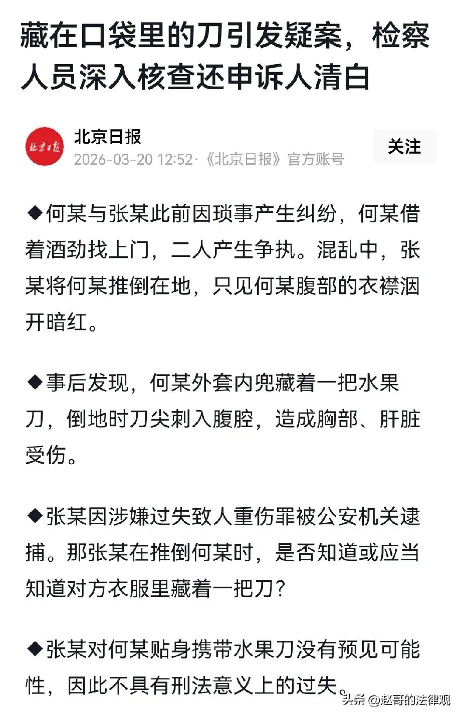 推倒藏刀者反留案底?正义也许会迟到,但绝不会缺席 今儿咱们单说一桩发生在辽宁东港的“离奇冤案”。这事儿,听着像“天方夜谭”,实则是一记狠狠抽在公平正义脸上的“响亮耳光”。张某本是看客,却被醉酒寻衅的邻居何某纠缠,推搡间对方倒地,竟因自身体内藏刀而重伤。张某不仅垫付医药费,还换来一纸谅解书,本以为“花钱消灾”能买个心安,谁曾想,一纸“酌定不起诉”决定,让他背上了“微罪”的案底。这哪是“息事宁人”?分明是“哑巴吃黄连”,有苦说不出! 想当年,咱们总觉得“退一步海阔天空”,做个“老实人”总不会吃亏。可现实却给了张某一记“当头棒喝”。对方口袋藏刀,这本就是“不可预见”的意外,张某的推搡与重伤结果之间,本无刑法上的因果关系。可最初的司法认定,却让他背负了八年的心理枷锁。这不仅仅是张某一个人的委屈,更是对所有“与人为善”者的拷问:如果善良和退让换不来清白,那谁还敢在冲突中保持克制? 但这“反转”的背后,藏着的正是咱们今天要说的“大健康”格局。真正的健康,讲究“内外双调”。外在,咱们得学会“敬畏法律”,别让那“和稀泥”的执法成了社会的“隐患”,法律的尊严在于精准,而非模糊的妥协;内在,这“感恩之心”更是不可或缺。我们要感恩这“法治的进步”,最高检的介入纠错,让正义的曙光终于穿透迷雾;更要感恩这“较真的勇气”,它让我们明白,每一个公民的清白都值得被捍卫,每一次精准的纠错都是在为法治中国“添砖加瓦”。这种“法不能向不法让步”的通透,才是滋养社会肌体的“灵丹妙药”。 我们要感恩这“岁月的沉淀”,它虽漫长,却让真相在时间的洗礼下愈发清晰。 愿世间少一些“模糊不清”的判决,多一些“是非分明”的正义。 愿你我皆安康,前程皆似锦! 辽宁案件
