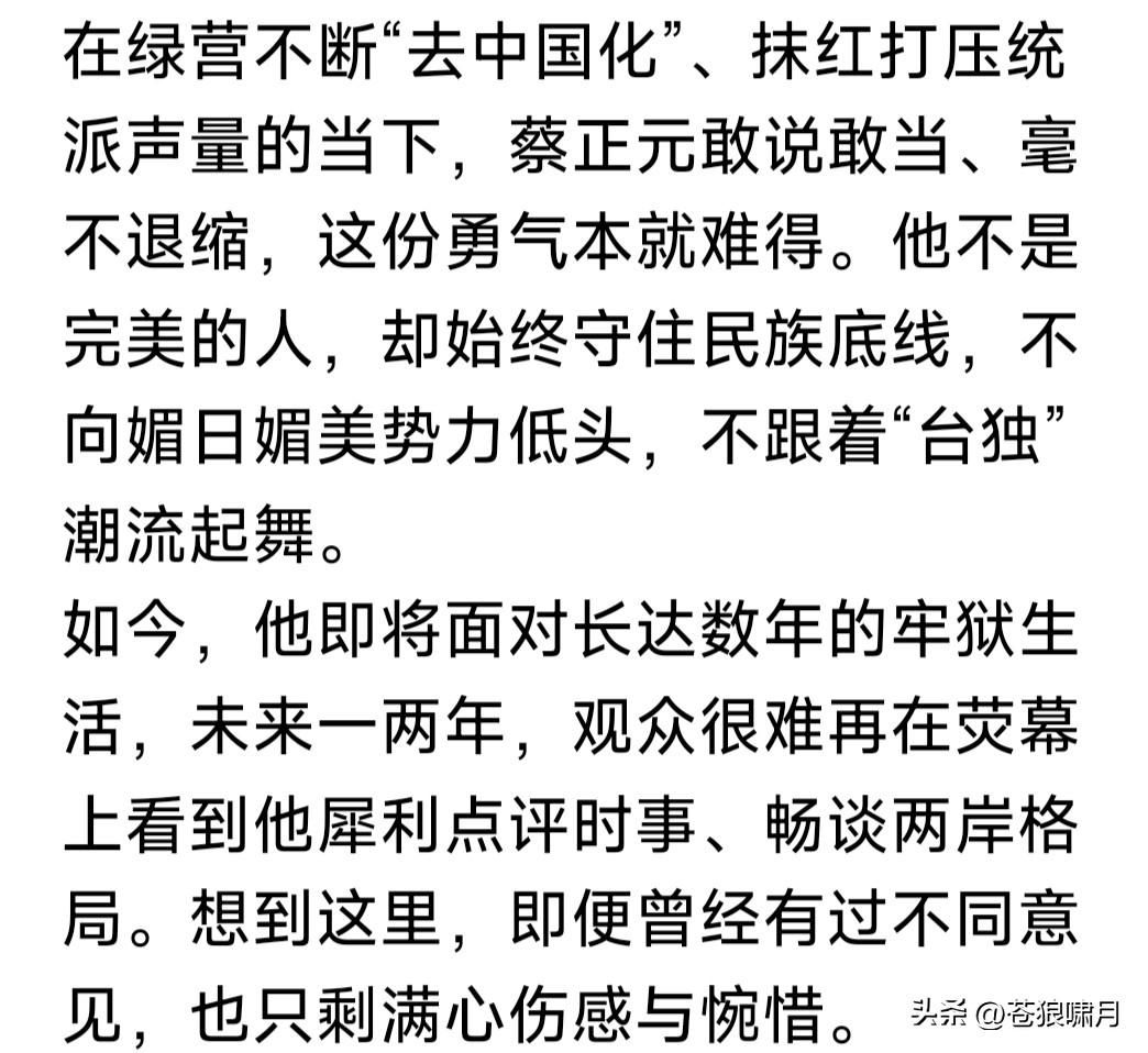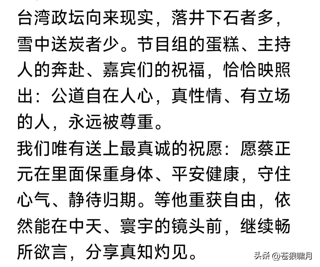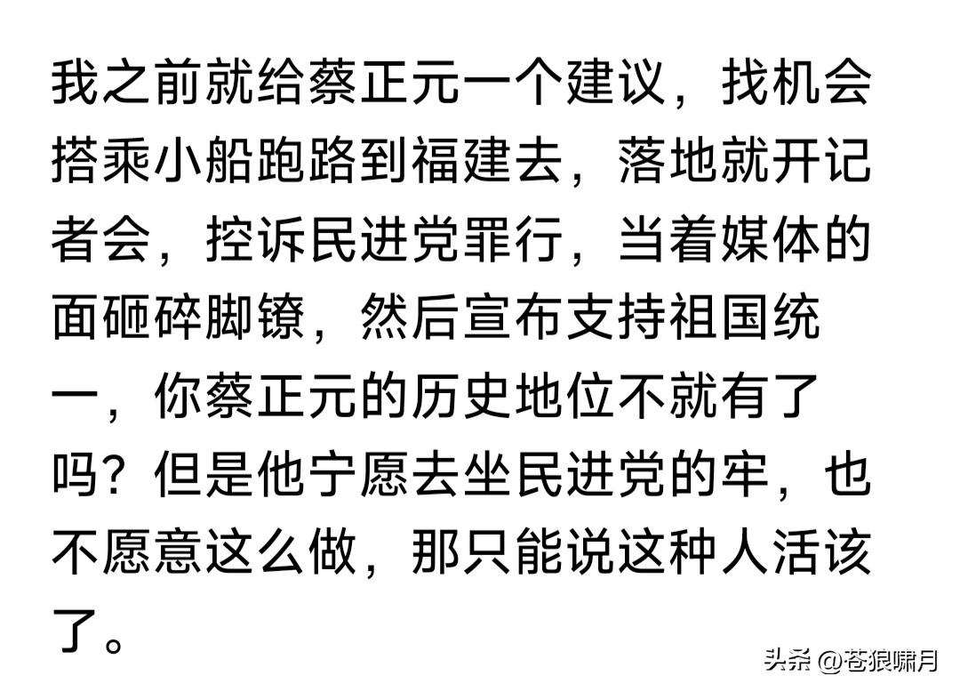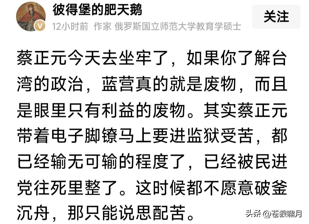 蔡正元要去坐牢!苍狼看到两篇文章,一个是“彼得堡肥天鹅”,另一个是网友“火星”。两篇文章高下立见。 1.“肥鹅”认为:蓝营是废物,是眼里只有利益的废物!蔡正元要进监狱“受苦”,说明已经输无可输,蓝营竟然无动于衷,还不破釜沉舟只有忍受? 他还认为蔡正元也如此!应该找机会跑到福建,召开记者发布会,控诉民进党罪行,当众砸“镣铐”,公开支持祖国统一。但他宁愿坐牢也不去做? 2.“火星”文章较客观:称老蔡临去坐牢,还坚持做最后一期节目。主持人原本有事请假,闻听放下私事返回,与一众名人嘉宾为他捧场。并购买一盒蛋糕,表示暂时告别,情景令人感动! 众所周知,蔡正元是蓝营民代,统派名嘴,虽有时言辞激烈,有些冲动,但其基本倾向是反对台独,主张统一。因此让“赖当局”恨之入骨,这次以无须有罪名迫其入狱,就是明证之一。 环宇电视台节目组,为老蔡赠送蛋糕,表面是“暂别”,其实是壮行,是祝福,祝他一路平安,早日归来!同时也是美好祈愿,祈愿两岸早日统一! 苍狼对“火星”文章,只有感动,不多说什么!就对“肥鹅”说几句吧! 1.“肥鹅”说是蓝营是废物,已经输无可输,还不破釜沉舟,活该思配苦!请问“肥鹅”:你让蓝营怎样“破釜沉舟”?当前要务是争取人心赢得大选吧? 2.蔡正元戴着“电子镣铐”,如何找机会偷渡福建,开记者发布会,揭露民进党罪行?还能成历史名人?他却没有这样做,甘愿坐牢,自找活受罪? 3.请问“肥鹅”一句话:“赖当局”为何敢如此专横跋扈,在证据不足情况下,把老蔡以“无须有罪名”强行入狱?其中原因是什么?不明白还是装糊涂?无非还是“老套路”,迎合“拳喷”赚流? 台湾是中国不可分割一部分!早晚必将回到祖国怀抱,但此事不能急。国家方针有两点:一是为两岸人民福祉,争取和平统一!二是努力发展经济,实现富民强国目标,台湾自然回归! 当然,我们也已划下“红线”:台湾当局不能宣布“台独”,外国军队不能登陆并控制台湾!如果越过这条“红线”,“回归”就变成“解放”,雷霆万钧之力谁也阻挡不了!试看谁敢跨越“红线”? …………