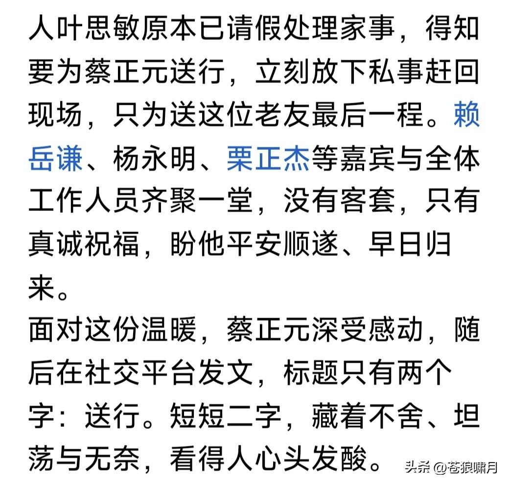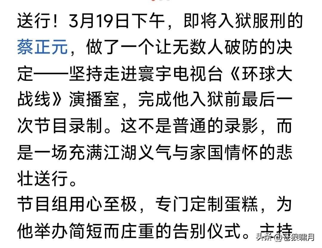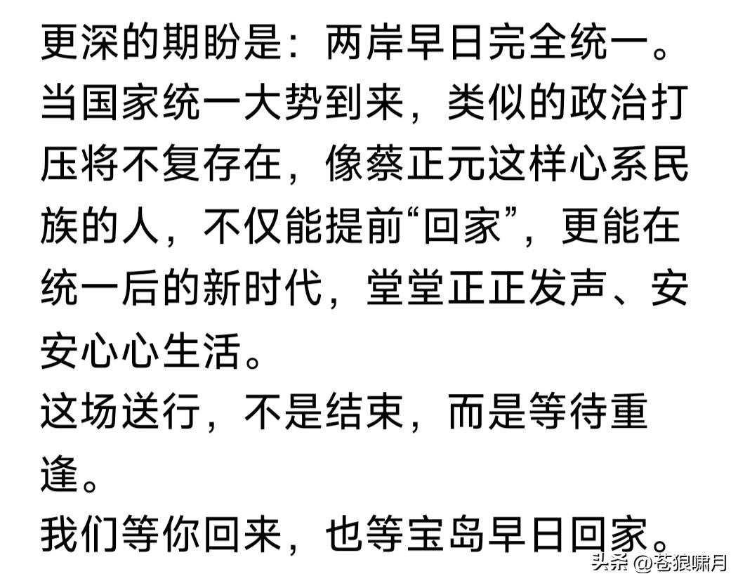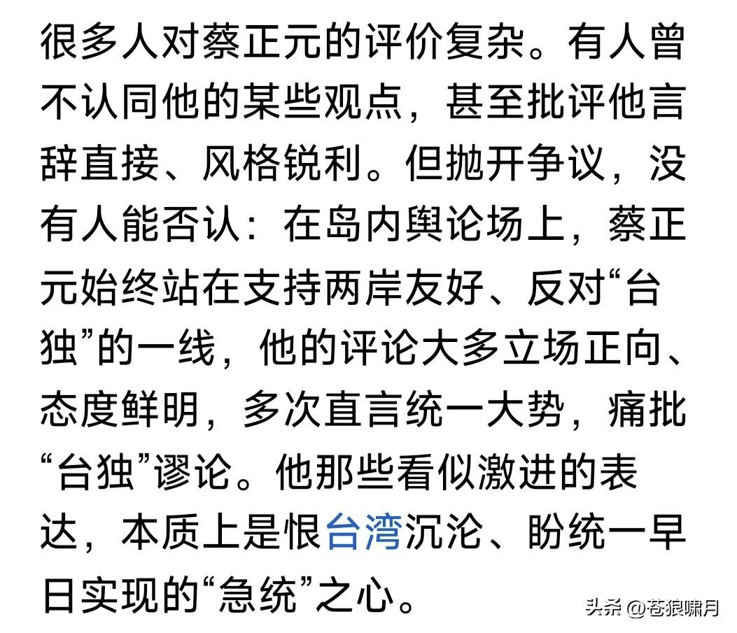 蔡正元要去坐牢!苍狼看到两篇文章,一个是“彼得堡肥天鹅”,另一个是网友“火星”。两篇文章高下立见。 1.“肥鹅”认为:蓝营是废物,是眼里只有利益的废物!蔡正元要进监狱“受苦”,说明已经输无可输,蓝营竟然无动于衷,还不破釜沉舟只有忍受? 他还认为蔡正元也如此!应该找机会跑到福建,召开记者发布会,控诉民进党罪行,当众砸“镣铐”,公开支持祖国统一。但他宁愿坐牢也不去做? 2.“火星”文章较客观:称老蔡临去坐牢,还坚持做最后一期节目。主持人原本有事请假,闻听放下私事返回,与一众名人嘉宾为他捧场。并购买一盒蛋糕,表示暂时告别,情景令人感动! 众所周知,蔡正元是蓝营民代,统派名嘴,虽有时言辞激烈,有些冲动,但其基本倾向是反对台独,主张统一。因此让“赖当局”恨之入骨,这次以无须有罪名迫其入狱,就是明证之一。 环宇电视台节目组,为老蔡赠送蛋糕,表面是“暂别”,其实是壮行,是祝福,祝他一路平安,早日归来!同时也是美好祈愿,祈愿两岸早日统一! 苍狼对“火星”文章,只有感动,不多说什么!就对“肥鹅”说几句吧! 1.“肥鹅”说是蓝营是废物,已经输无可输,还不破釜沉舟,活该思配苦!请问“肥鹅”:你让蓝营怎样“破釜沉舟”?当前要务是争取人心赢得大选吧? 2.蔡正元戴着“电子镣铐”,如何找机会偷渡福建,开记者发布会,揭露民进党罪行?还能成历史名人?他却没有这样做,甘愿坐牢,自找活受罪? 3.请问“肥鹅”一句话:“赖当局”为何敢如此专横跋扈,在证据不足情况下,把老蔡以“无须有罪名”强行入狱?其中原因是什么?不明白还是装糊涂?无非还是“老套路”,迎合“拳喷”赚流? 台湾是中国不可分割一部分!早晚必将回到祖国怀抱,但此事不能急。国家方针有两点:一是为两岸人民福祉,争取和平统一!二是努力发展经济,实现富民强国目标,台湾自然回归! 当然,我们也已划下“红线”:台湾当局不能宣布“台独”,外国军队不能登陆并控制台湾!如果越过这条“红线”,“回归”就变成“解放”,雷霆万钧之力谁也阻挡不了!试看谁敢跨越“红线”? …………