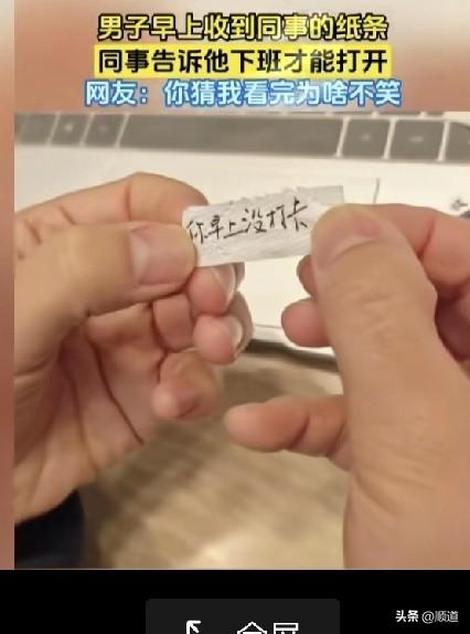 男子早上收到同事递过来的纸条,他一看,上面写着,下班再打开。 男子也没多想,就把纸条放在了一边。 下班了,男子一层一层一层一层的一共打开4层纸条,才发现里面最小的一张小纸条,上面写着,你早上上班没打卡。 男子这个气呀,但是好像同事也没错,错就错在他太遵守规则了。 假如是我,我会偷偷的打开,因为我的好奇心比较重,要我等一天,我等不了。[笑哭]