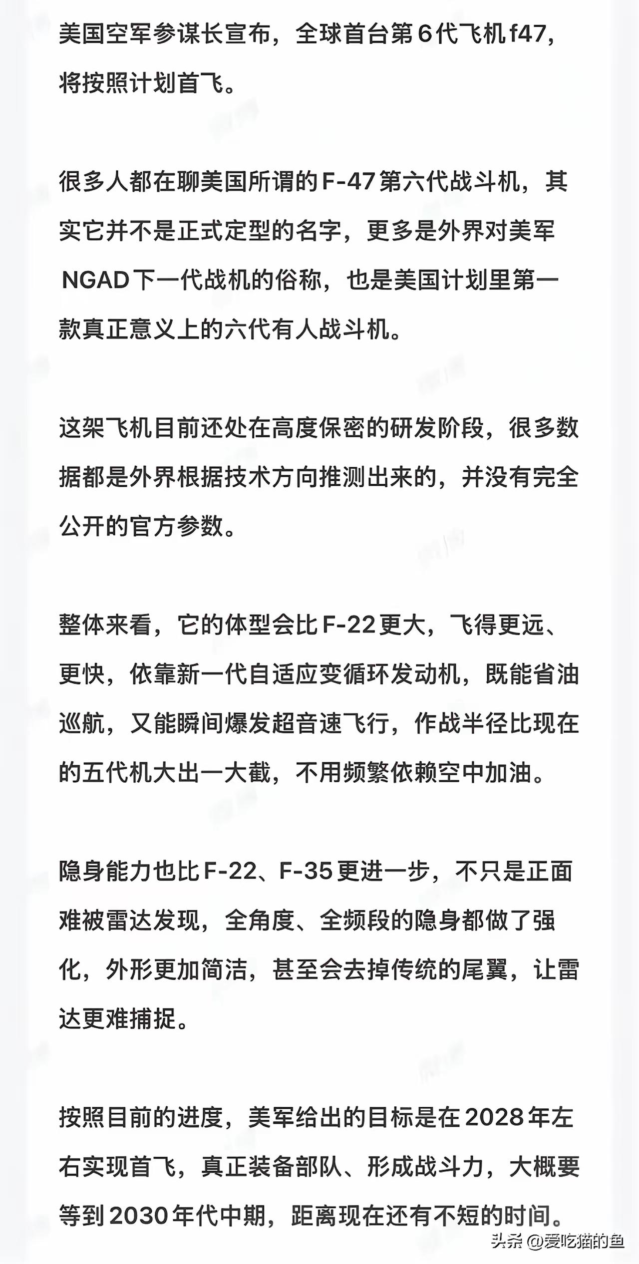美国空军参谋长David Allvin将军曾在去年公开表态,美国第一架F-47正在建造中,预计2028年首飞。 美国的预计到期了都可以随时推迟!这个时间段差不多是特朗普卸任的日子,到时候换个总统这架飞机试飞时间估计就会变得遥遥无期了! 美国的航母,载人绕月飞行计划,都是好几年前就预计什么时候发射服役,然后一到预计的时间就有各种理由推迟。 按照这种情况,这个F47飞机估计换个总统项目就黄了。 六代就算美国能够明年试飞也没有任何作用,别的国家已经有几款六代机在空中翱翔了!