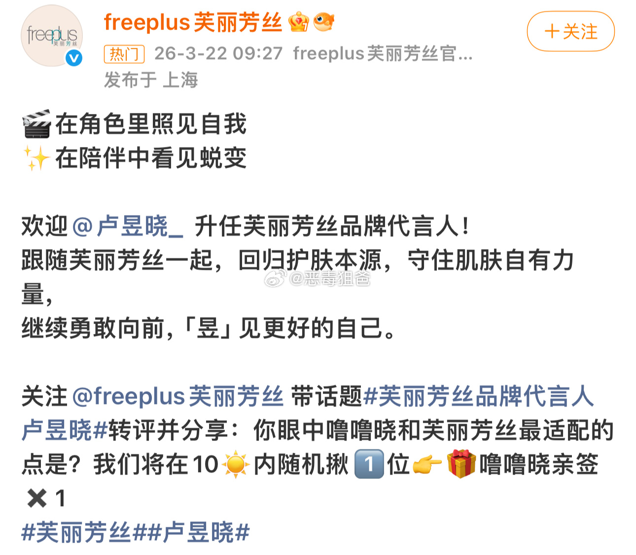 恭喜卢昱晓成为芙丽芳丝品牌代言人