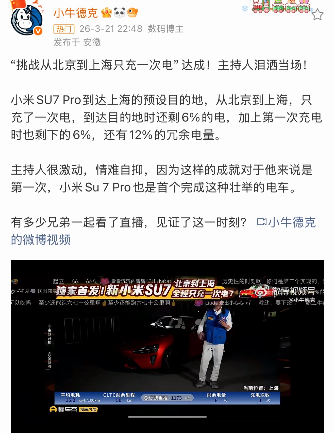 小米SU7 Pro这波真的太狠了,北京到上海1173公里,一脚电门干过去就充了一次,到地还剩6%,主持人直接激动到飙泪,我隔着屏幕都能感受到那种震撼。这哪是测续航,分明是在给纯电轿车正名,以前总有人说电车跑不了长途,现在SU7 Pro用实力把脸打肿。
