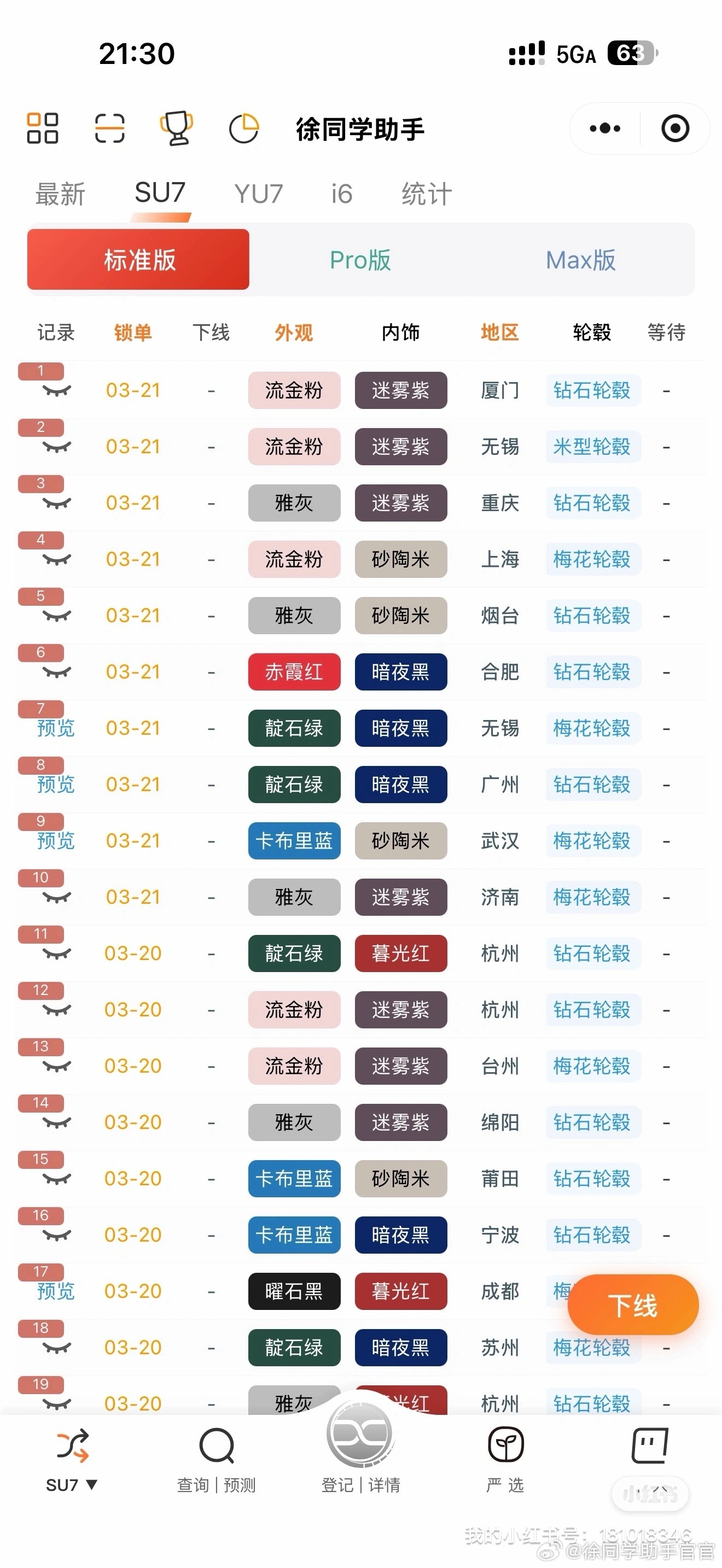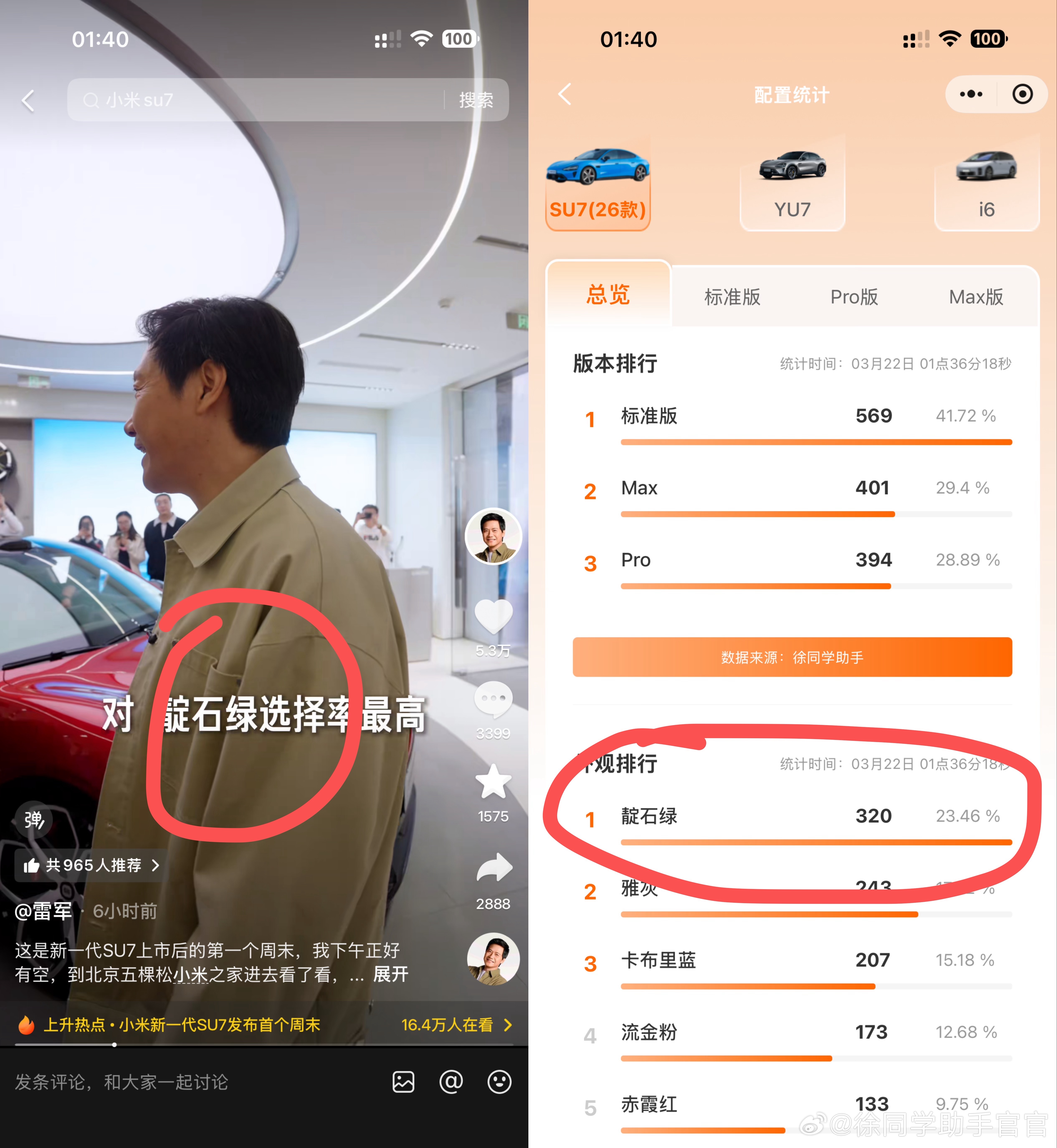 如徐同学助手统计,自新款小米SU7发布以来,下单选择率最高的就是靛石绿。内饰中,大牌靛石绿选择最多的分别是是砂陶米、迷雾紫、暗夜黑。