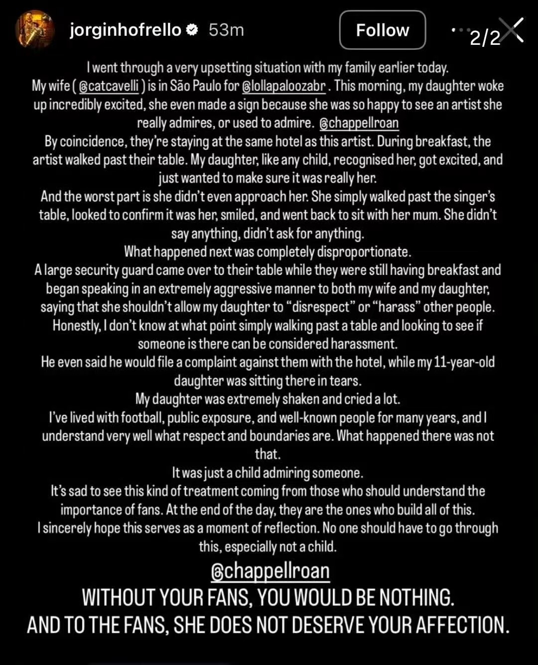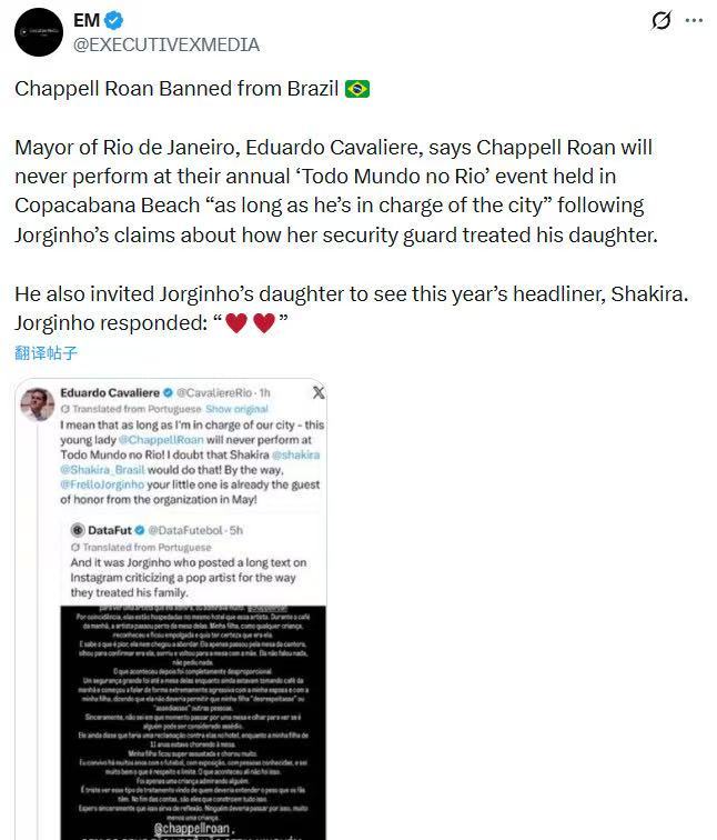 插排姐安保团队惹争议 意大利球星若日尼奥发长文控诉插排姐Chappell Roan的安保团队,粗暴对待其11岁继女Ada(裘德洛女儿)。Ada被插排姐安保团队成员质问后“受到了极大的惊吓”并大哭,引发巨大热议。里约市长Eduardo Cavaliere发推谴责插排姐,表示只要他在位一天,绝不允许插排姐来里约的Todo Mundo no Rio音乐节表演。