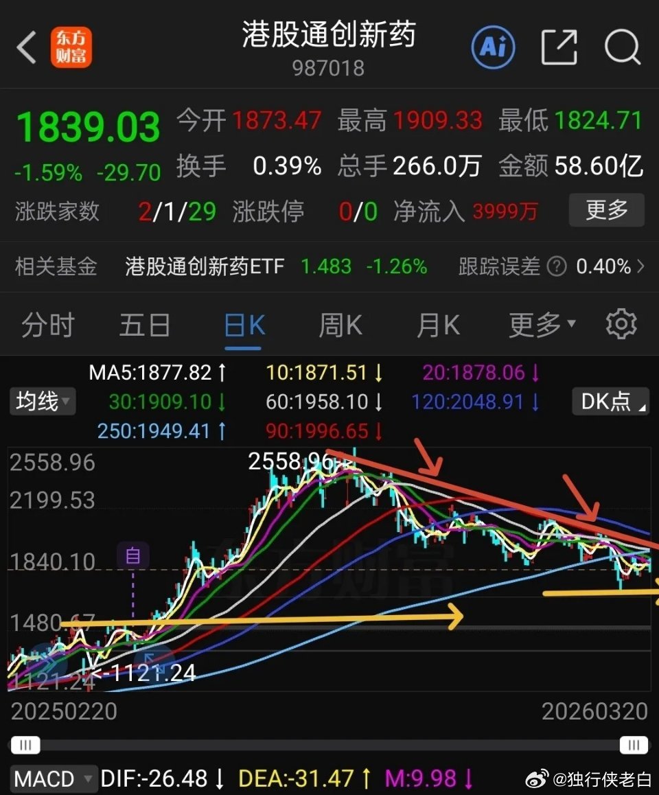 创新药回调空间有多大? 下图是港股通创新药及中证创新药走势。短线明显的是下跌趋势,港股通创新药下周首先是要回踩前面低点支撑,大约还有6%空间。 假如这次回踩到这个位置能止跌企稳,那么后面还要继续反弹到上方压力线附近。 如果回踩到前低支撑没有止跌企稳,那就会继续探底,第一目标是考验250周线支撑,大约还有10%下跌空间。 中证创新药走势也不乐观,它一般是跟随港股通创新药走势,假如近期下面低点守不住的话,有可能回踩周线前面那个小双底支撑,回调时间比较长,周线级别,大约还有16%的下跌空间。 总之,大环境不配合,创新药走势也不会好,创新药磨底时间比较长,要做好长期思想准备,短期小仓位参与做波段操作,中长期慢慢低吸布局,预计今年它的性价比还是不错的。