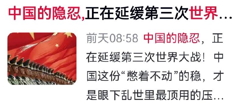 绝命守护!中国隐忍背后,是拦住三战的最后一道防线 如今世界战火四起、局势紧绷,全球早已像一个堆满火药的仓库。而第三次世界大战迟迟未爆发,关键正是中国的战略隐忍。 这不是懦弱,而是大国对和平的担当。我们深知,一旦被逼出手,世界必将分裂为两大阵营死斗,经济封锁、物资断供、物价飞涨,无人能置身事外。 中国饱经战乱之苦,更懂和平珍贵。我们坚守底线、保持克制,以一己之力斡旋劝和,硬生生将大战拦在门外。忍耐是护佑苍生,绝非畏惧强权。 为中国的大国定力点赞,愿山河无恙,世界安宁。 对此,你是怎样认知度?欢迎各位读者来评论区讨论留下你的认知度! 中国守护和平 大国担当 拒绝世界大战 和平来之不易