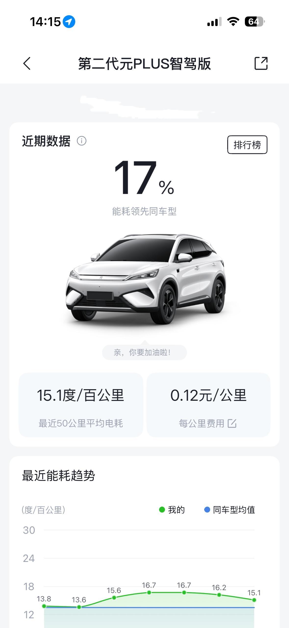 🔋说实话,这台元PLUS这15.1kWh/100km我真觉得不算高。要知道路况也很重要,每天二十分钟路程,十分钟堵着走,剩下也就四十码,再加空调和座椅加热,表显15.1kWh/100km已经算正常发挥了。不过有一说一,虽然车不怎么费电,但冬天有点不友好,建议维保下,看看哪里出了问题。【来自懂车帝车友圈】