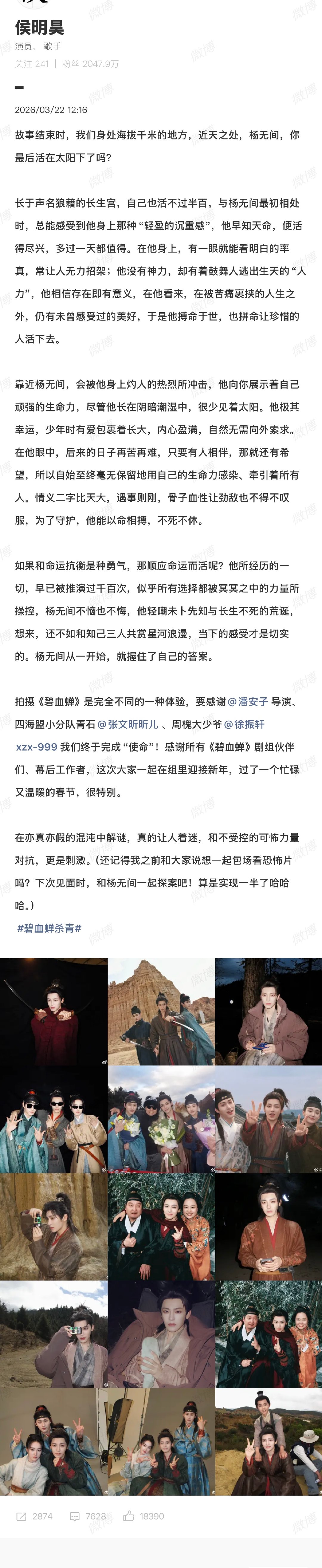 侯明昊长文告别碧血蝉侯明昊碧血蝉杀青晒照3月22日,发长文告别《碧血蝉》,并晒杀青照。